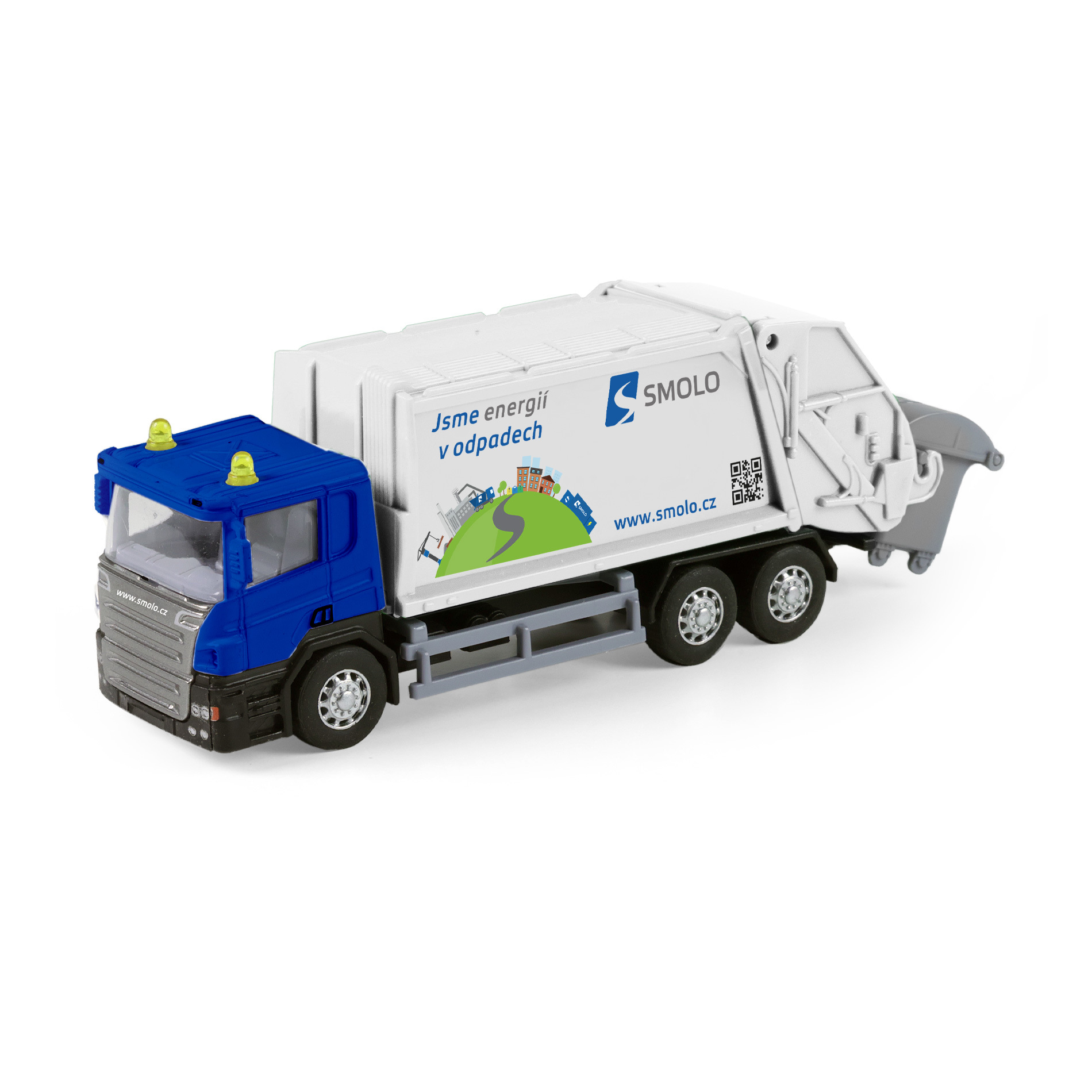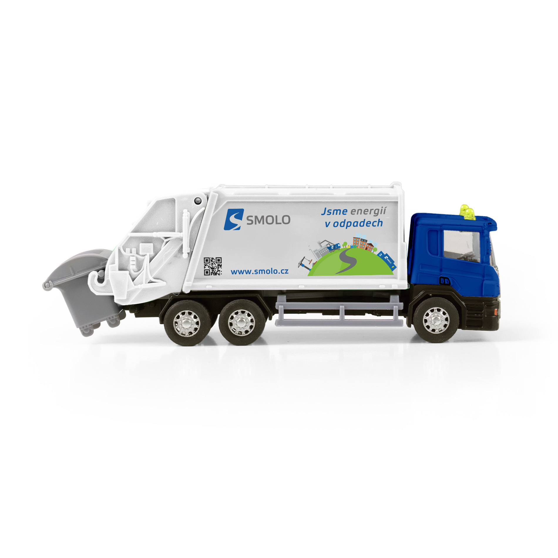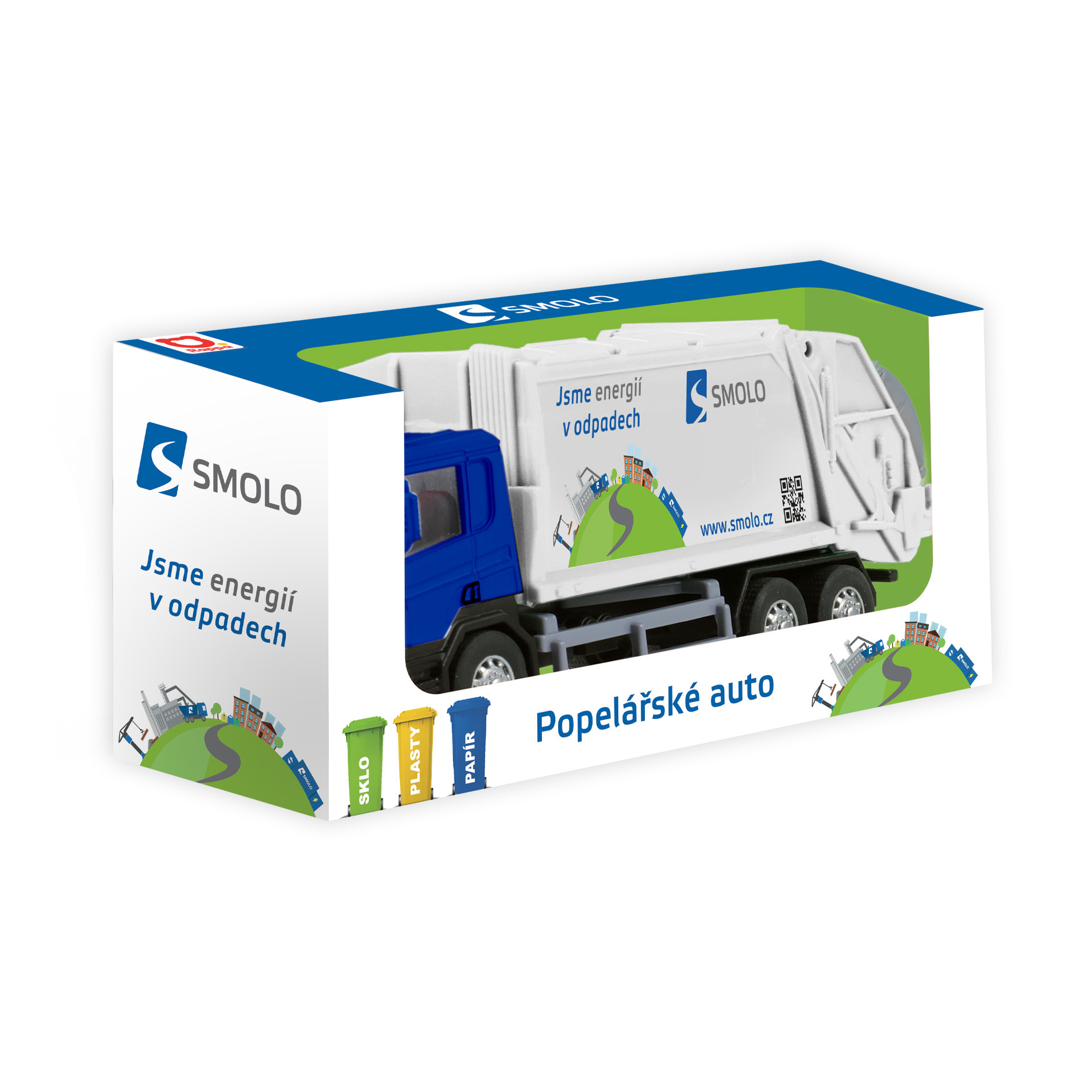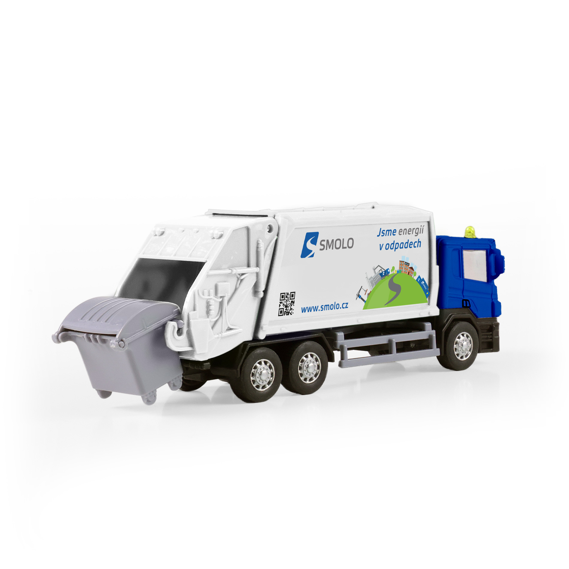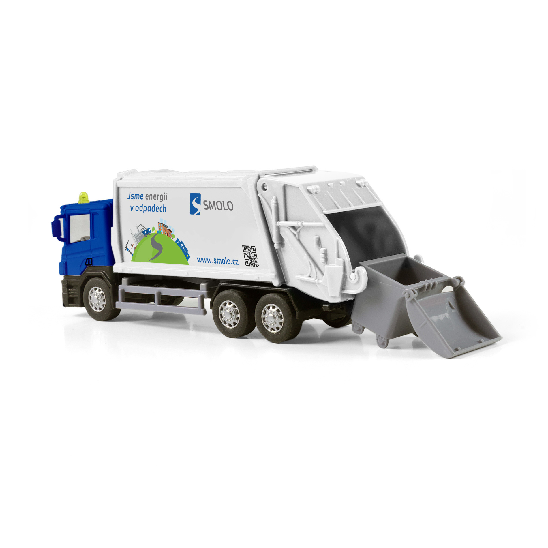 Kovové popelářské auto s plastovou korbou a logem SMOLO. Korba má v zadní části odklápěcí dveře, součástí je otevírací popelnice. Auto jezdí na zpětný chod a jeho délka je 15 cm.
