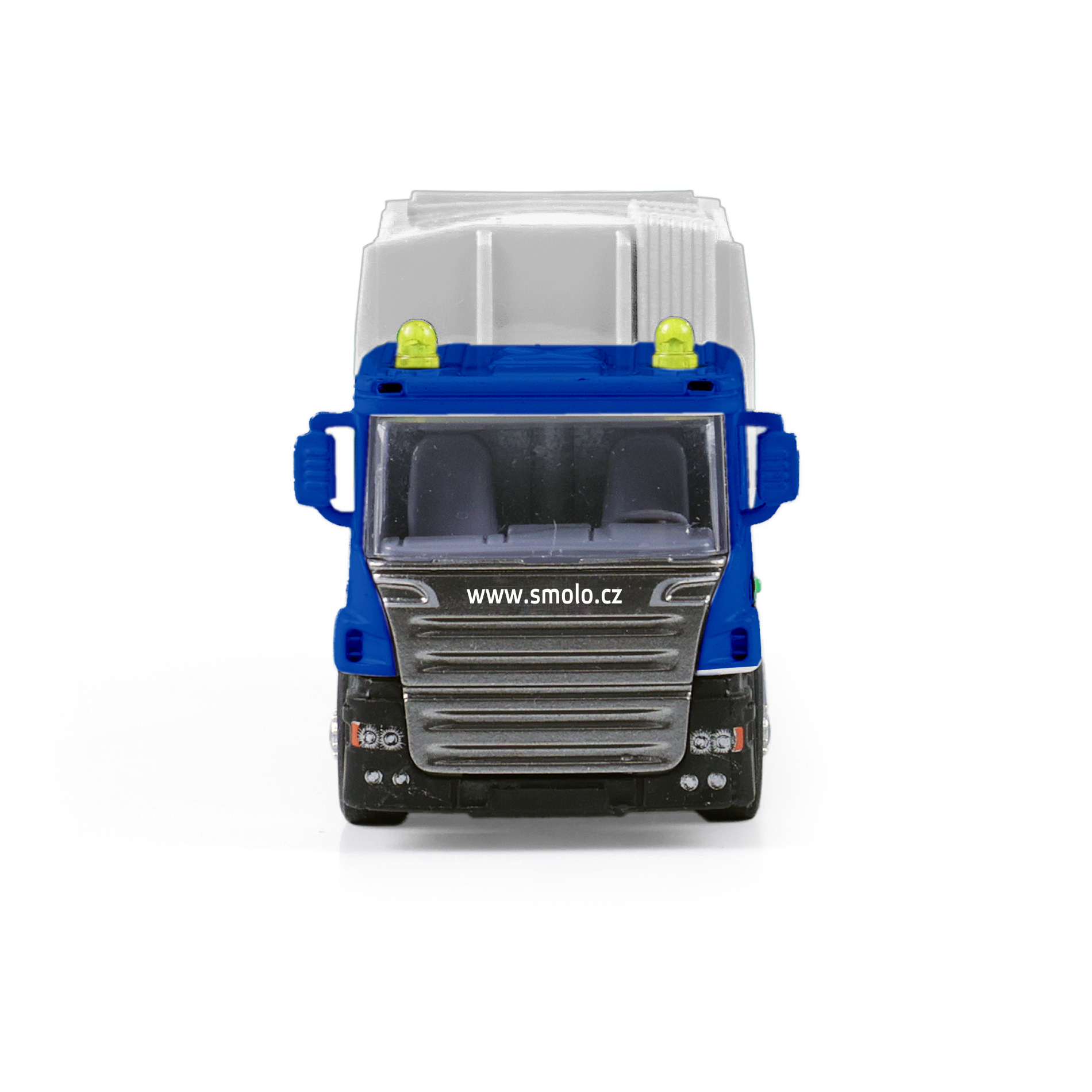 Kovové popelářské auto s plastovou korbou a logem SMOLO. Korba má v zadní části odklápěcí dveře, sou