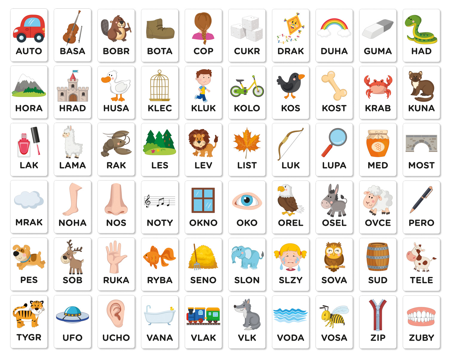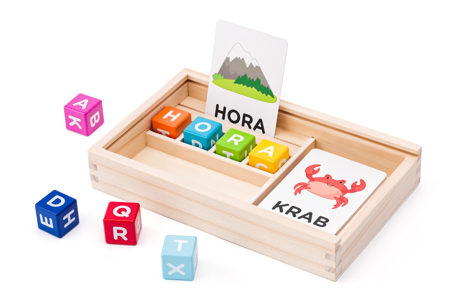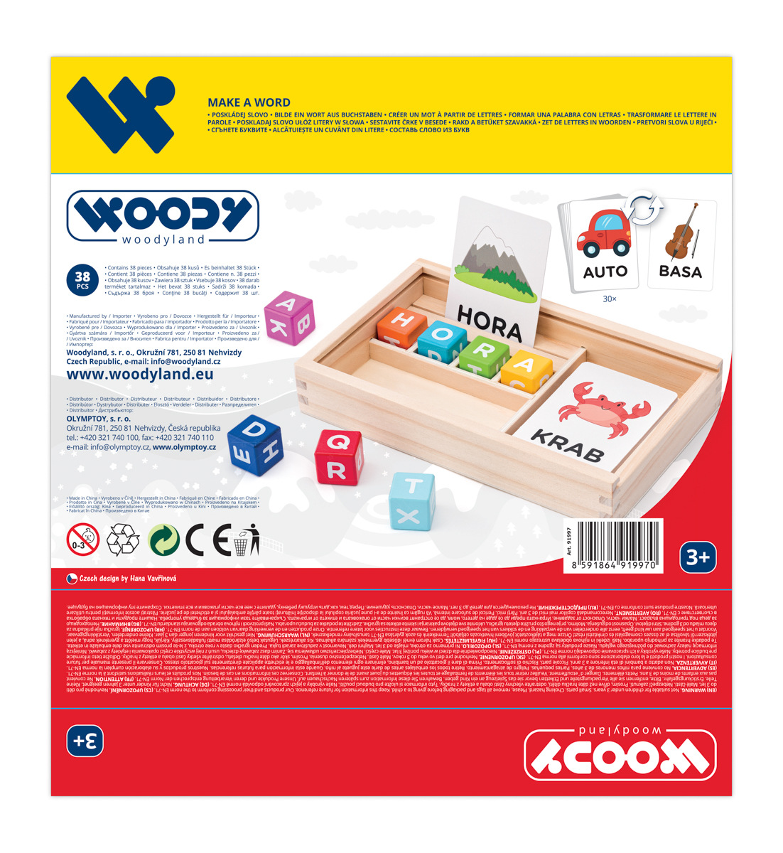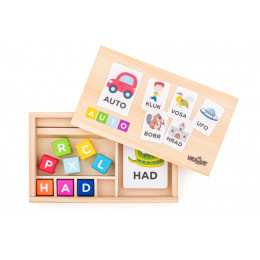Tato hra patří mezi první formy smysluplného poznávání písmen a skládání slov. Dítě si vybere obrázek s krátkým názvem a zasune ho do stojánku. Na barevných kostičkách se pak snaží najít jednotlivá písmena a správně je poskládat. Hračka je dílem českého výtvarníka.| Rozměr výrobku: 23 x 14 x 3,9 cm