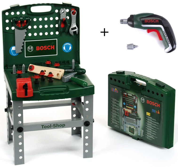 Pracovní stůl Bosch. Spoustu nářadí, se kterým může malý opravář všechno opravit. Pracovní stůl se dá lehce složit do kufříku. Součástí je aku šroubovák na baterie, které nejsou součástí balení 2X R03. Vhodné pro děti od 3 let.