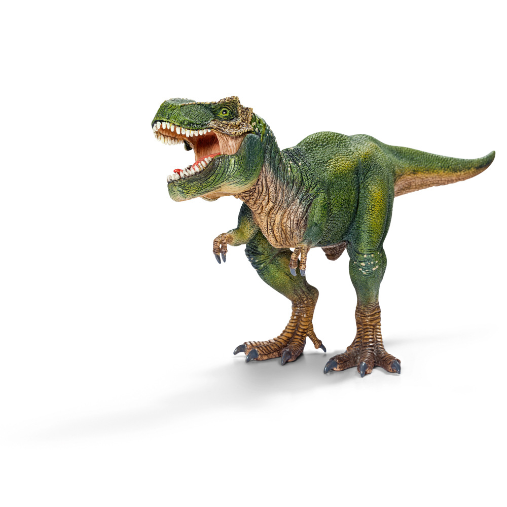 Třináct metrů dlouhý tyranosaurus byl dvounohý dravý veleještěr s mohutnou hlavou a silnými čelistmi, které byly vybaveny zuby dlouhými i přes 20 centimetrů. Tyranosaurus rex vypadal velmi hrozivě, mohl ale jen stěží používat své krátké přední končetiny vybavené jen dvěma drápy, protože ty nedosahovaly ani po jeho tlamu. Se svou výškou téměř sedm metrů a délkou až třináct metrů nebyl tyranosaurus rex žádným dobrým lovcem, ale mrchožroutem, který se živil tím, co nechala ostatní zvířata ležet. Měl více než padesát zubů s délkou až 15 centimetrů, které však nepoužíval ke žvýkání, ale k trhání, neboť svou potravu polykal ve velkých kusech. Pro zlepšení vnímání hloubky při hledání potravy směřovaly oči tyranosaura rexe dopředu, takže se zorná pole obou očí křížila. Pokud tento ohromný dravec ztratil jeden ze svých dýkovitých zubů, narostl mu během několika týdnů nový. Tyranosaurus má pohyblivou dolní čelist. Rozměr: 28 x 14 x 9,5 cm. Nevhodné pro děti do 3 let. Doporučený věk: 4-10