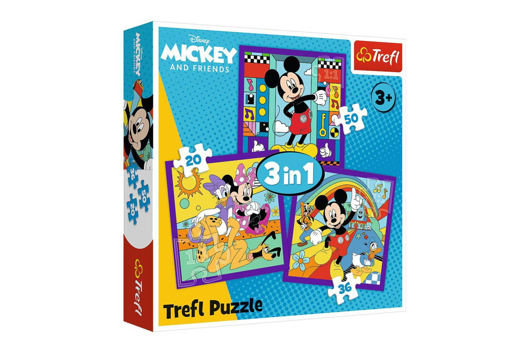 Popis Trefl Puzzle 3v1 Mickey a jeho veselá parta 20x19,5cm v krabici 28x28x6cm