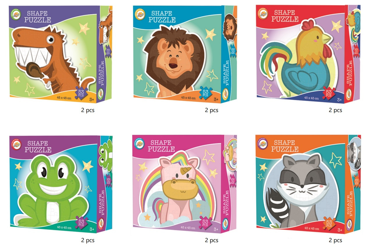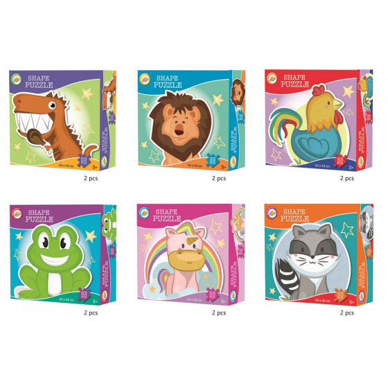 Puzzle 53 dílků 45x40 cm 6 druhů (Dino, Lev, Kohout, Žába, Jednorožec, Mýval). Nelze vybrat druh, dodáváme dle skladové dostupnosti.