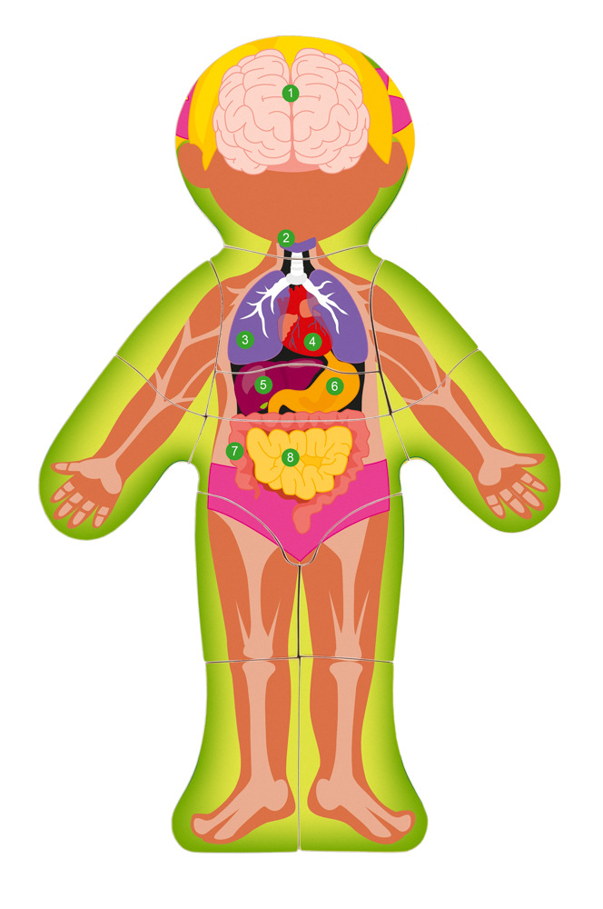 Anatomie lidského těla pro nejmenší. Po otočení lícové části puzzle (kůže), vidí dítě na rubu orgány a pod nimi kosti, které se na tomto místě skrývají. Vše je opatřeno popisky a základními názvy v češtině. Rozměr: 22,5 x 30 x 0,8 cm | Balení obsahuje 13ks | Věk: 3+
