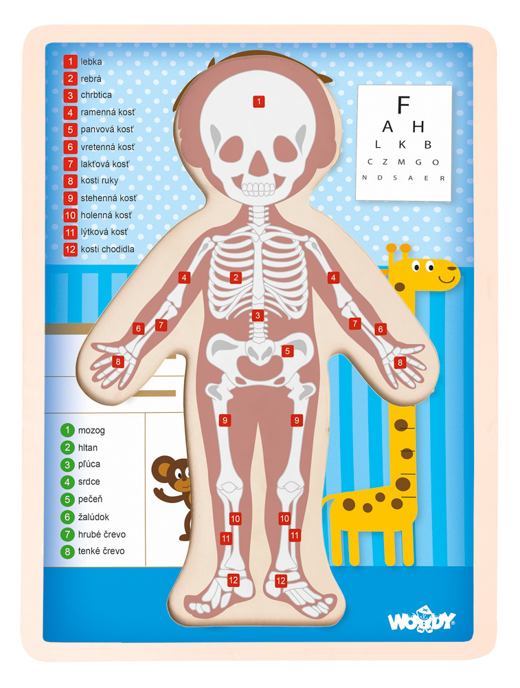 Anatomie lidského těla pro nejmenší. Po otočení lícové části puzzle (kůže), vidí dítě na rubu orgány a pod nimi kosti, které se na tomto místě skrývají. Vše je opatřeno popisky a základními názvy ve slovenštině. Rozměr: 22,5 x 30 x 0,8 cm | Balení obsahuje 13ks | Věk: 3+