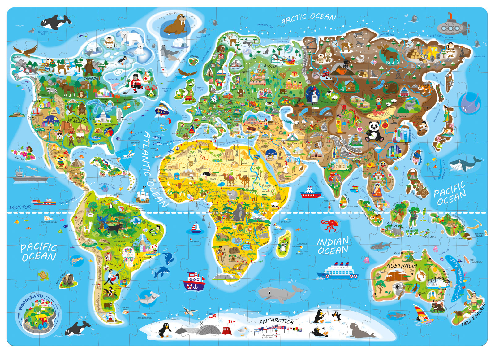 Milujete cestování a skládání puzzle? Pak je tato mapa světa přesně pro vás. Zeměpisné puzzle pro děti s mapou světa a ilustracemi v podobě světových památek a turisty vyhledávaných míst. Puzzle vám pomohou naučit se jaká zvířata v daných oblastech žijí, jaké pamětihodnosti, stavby či přírodní útvary zde naleznou. Na puzzle najdete Eiffelovku, pyramidy nebo třeba sochu Svobody. Obrázky od českého výtvarníka. Počet dílků: 160 ks. Rozměr výrobku: 67,5x 47,5 cm. Rozměr balení: 31x22,5x7 cm. Věk: 3+