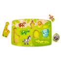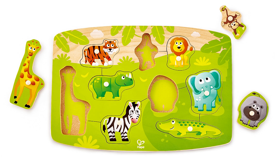 Puzzle na desce s obrázky zvířátek z džungle jsou v ideální velikosti pro malé ručičky. Sada obsahuje 10 dílků. Poutavé barevné provedení. Hračka pomáhá rozvíjet motorické dovednosti. Věk: 24m+. Rozměr: 29,4 x 20,8 x 1,8 cm.