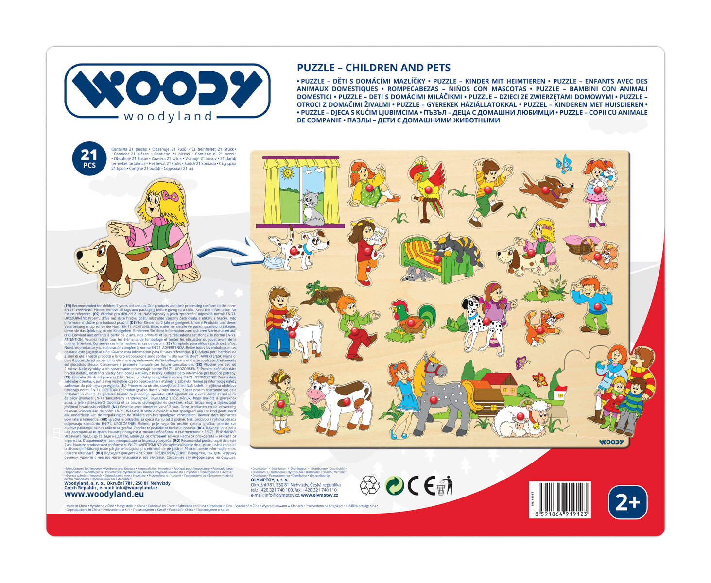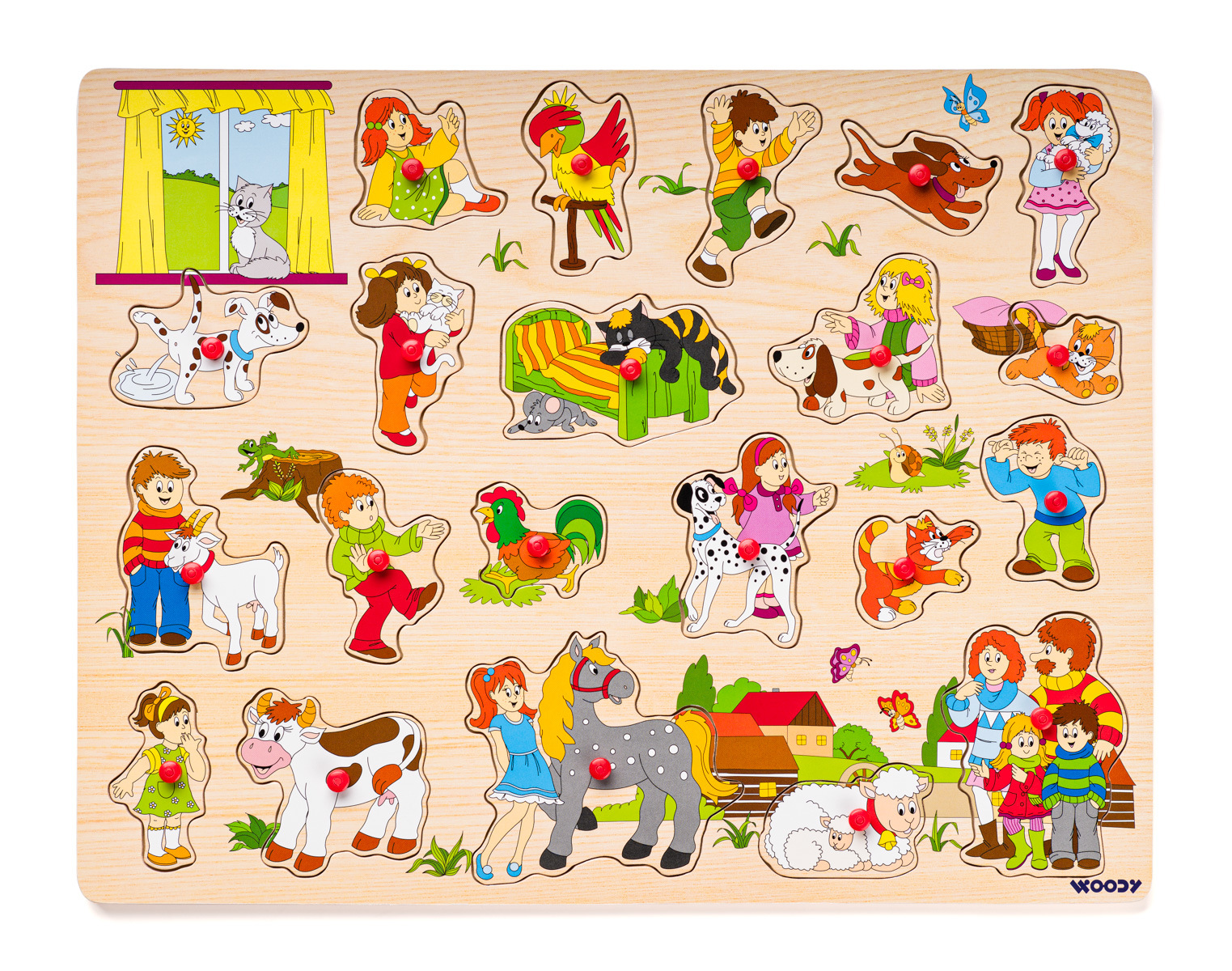 Velké puzzle s úchyty obsahuje 21 vkládacích obrázků. Hra s nimi rozvíjí jemnou motoriku, logiku, ale také emoční stránku dítěte. Obrázky zvířátek, dětí a rodinných příslušníků jsou dětem velmi blízké. Prostřednictvím hry se učí lásce ke zvířatům.| Věk: 2+ | Rozměr: 45x35 cm