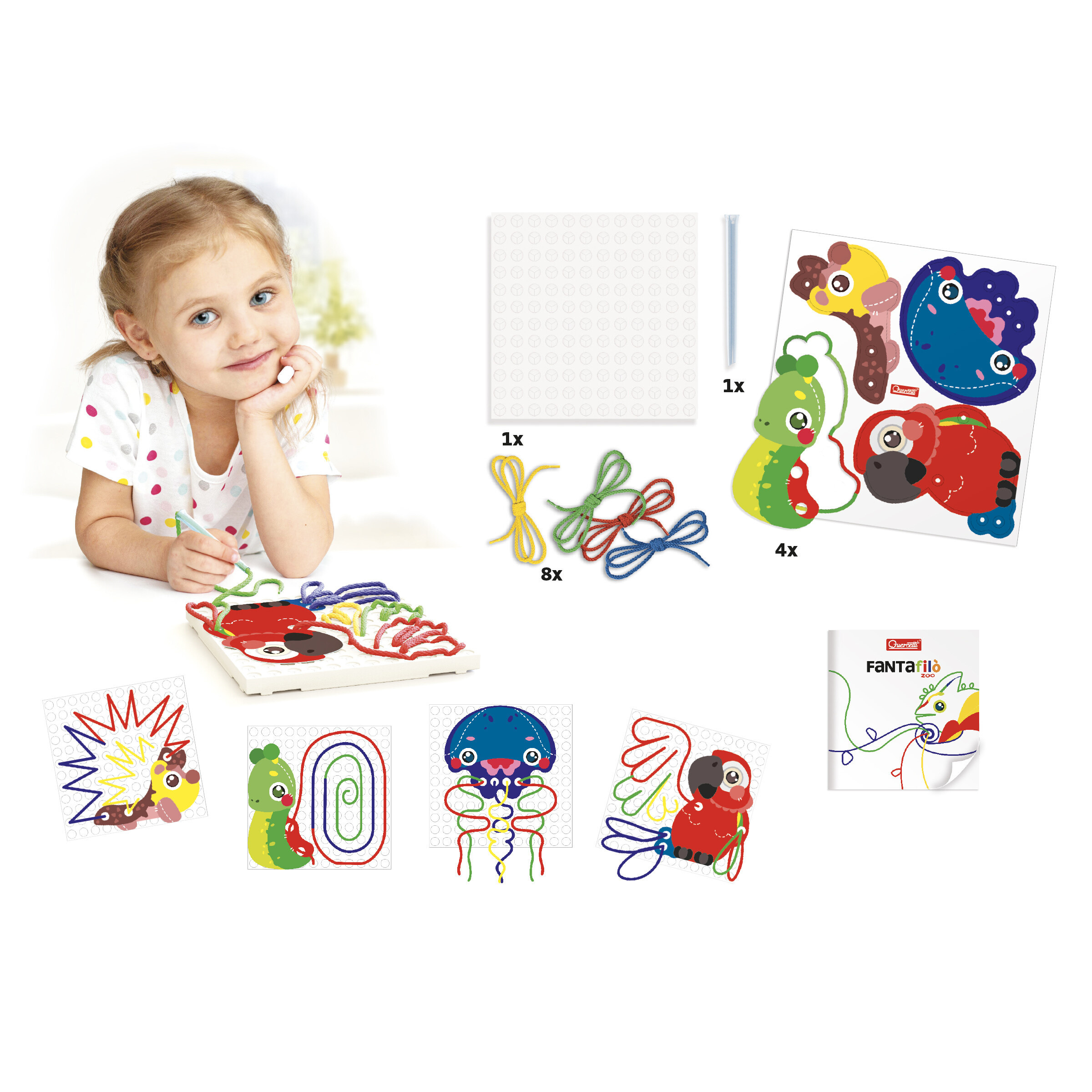 Vyšívací souprava určená dětem od 3 let. Sada obsahuje 8 šňůrek ve čtyřech základních barvách, 1 speciální pero určené k vyšívání, perforovanou desku, brožuru s předlohami a další 4 karty s předlohami, kterými se začátečníci mohou řídit. Obrázky se tvoří zasouváním šňůrek pomocí speciálního pera do otvorů hrací desky. Po nadzvednutí pera se otvor zatáhne a barevnou šňůrku pevně drží. Práce se soupravou Fantafilò pomáhá dětem uvolnit zápěstí, zlepšit vizuomotorickou koordinaci, jemnou motoriku a rozvíjí kreativitu.Více
