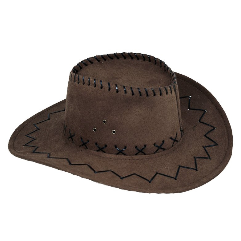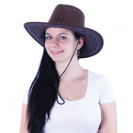 Elegantní kovbojský klobouk pro dospělé je vysoký 11 cm. Tento parádní kousek v hnědé barvě je navíc prošíván koženkovými pásky. Obvod klobouku je cca 56 cm.