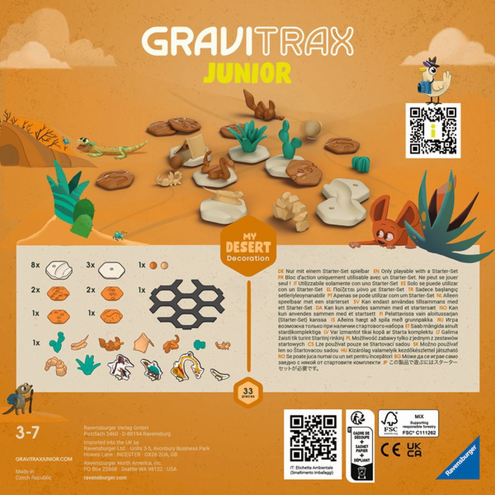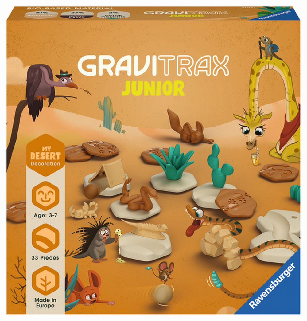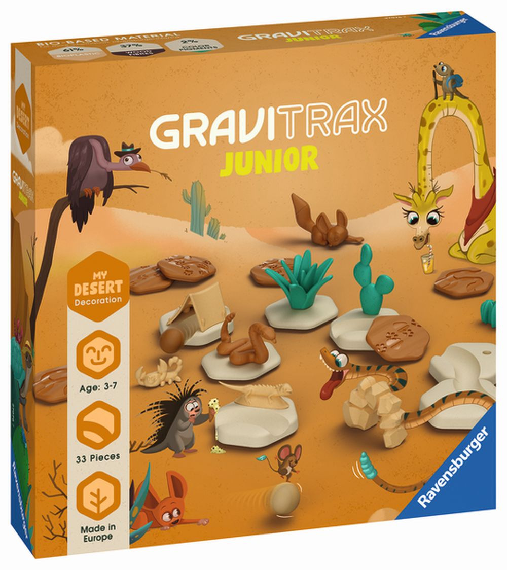 GraviTrax Junior je interaktivní systém kuličkové dráhy pro děti od 3 let. Ti nejmenší si staví své vlastní světy z kuličkových drah, které lze podle libosti zdobit a vytvářet tak jednotlivé tematické světy. Děti si tak při kreativním stavění užijí mnoho zábavy. Chlapci a dívky si mohou stavět své vlastní světy z kuličkových drah, které lze podle libosti zdobit a vytvářet tak jednotlivé tematické světy. Díky tomuto rozšíření Poušť, které obsahuje nejrůznější pouštní prvky a postavičky zvířat děti zažijí svět pouště zblízka. Všechny stavební a dekorační součásti jsou vyrobeny z dřevěného bioplastu.