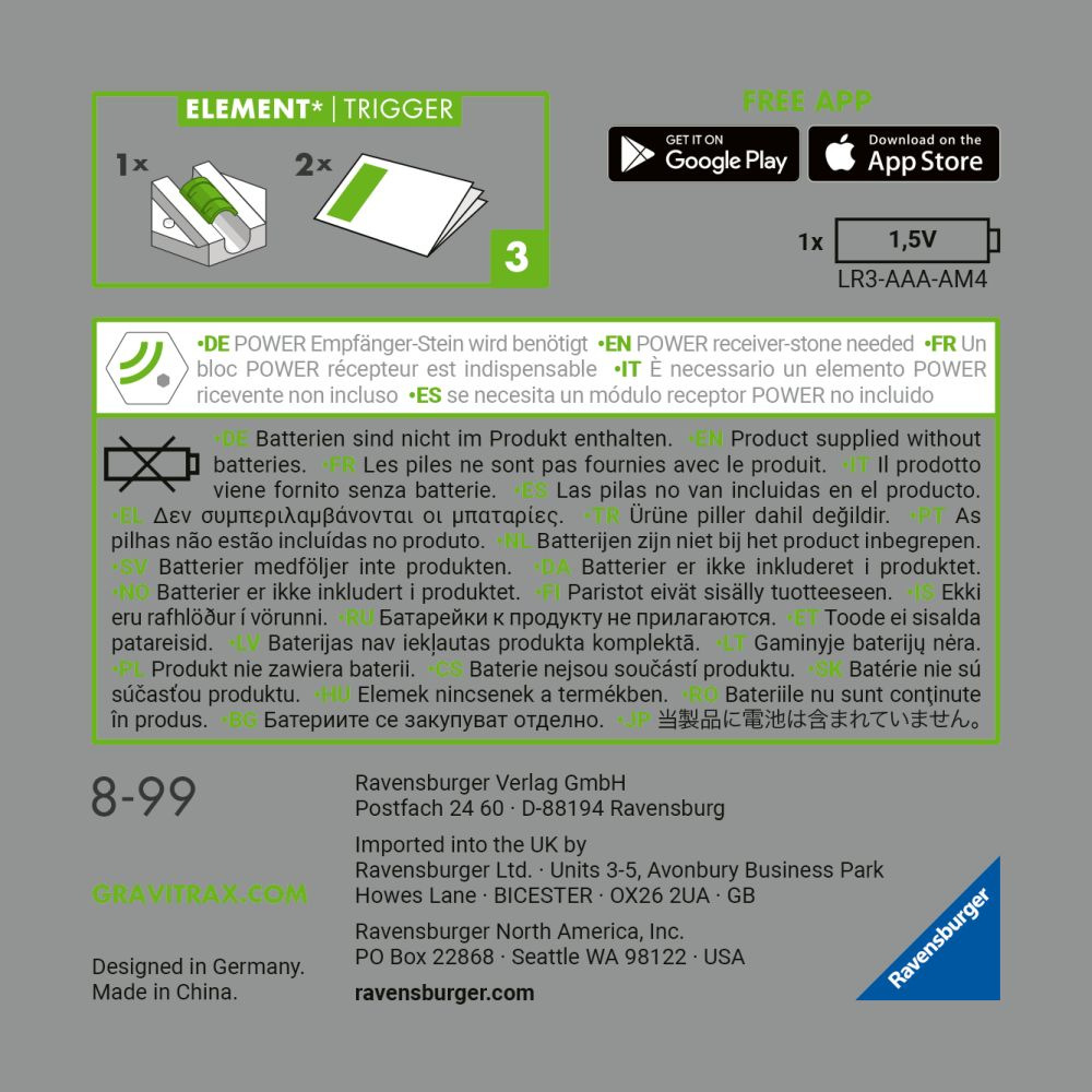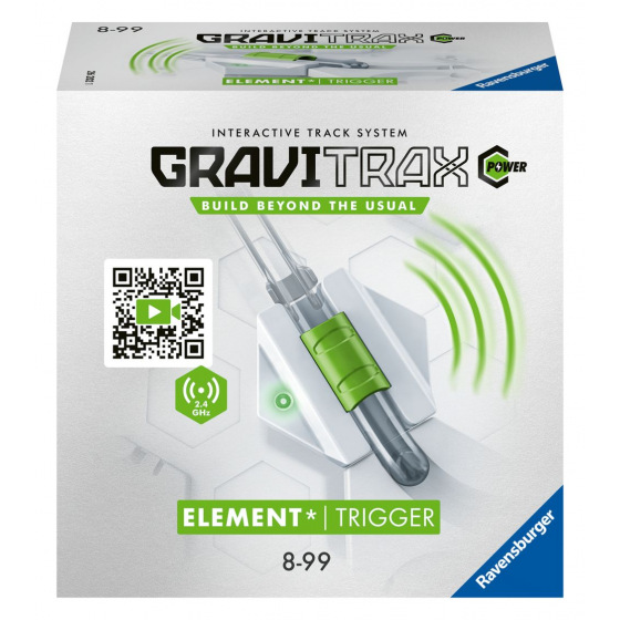 Spouštěč, akční doplněk vysílající signály. Odesílá signály do přijímačů na zvoleném kanálu. Propojení doplňků můžete ovlivnit pomocí Ovladače elektronických doplňků. \nPo projetí kuličky Spouštěčem do Přistávací Arény se vypustí na dráhu nová kulička ze Startéru. Projetí kuličky Spouštěčem také ovlivní přepnutí Výhybky. Vytvářejte pokročilejší dráhy s větším množstvím Spouštěčů - více Spouštěčů = více možností, více vyslaných signálů. Kompatibilní s ostatními doplňky GraviTrax Power. Lze zapojit do všech stavebních prvků z ostatních řad GraviTrax.