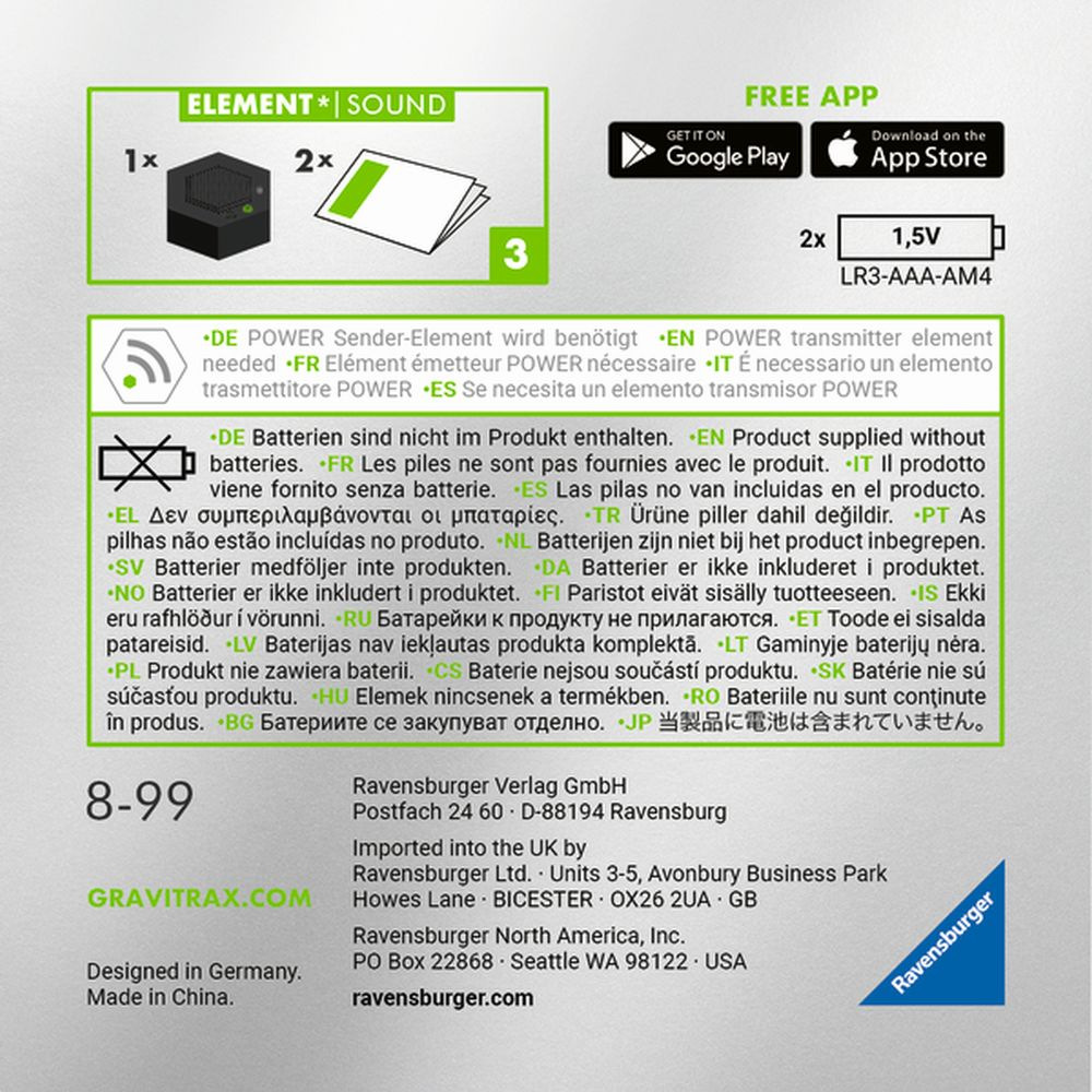 Se Zvukovým prvkem řady GraviTrax POWER lze do jakékoli dráhy GraviTrax integrovat skvělé zvukové efekty. Mezi všemi prvky GraviTrax POWER existují neviditelná spojení. Po přijetí signálu se spustí akční zvuk. Je možné přepínat mezi různými zvukovými světy. Kromě toho lze stisknutím tlačítka zvolit atmosférickou hudbu na pozadí. Budete potřebovat vysílací prvky GraviTrax POWER (nejsou součástí sady).