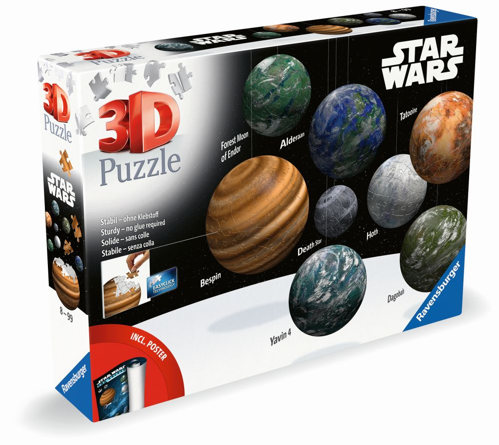 Původní trilogie Star Wars ožije u vás doma! Sestavte si vlastní soustavu 8 nejvýraznějších planet z Galaxie Star Wars z kvalitních plastových 3D Puzzle dílků. Realistické modely planet Hvězda smrti, Endor, Hoth, Yavin 4, Tatooine, Alderaan, Dagobah a Bespin si snadno uspořádáte a vystavíte díky praktickým stojánkům a podkladu pro sestavení Galaxie Star Wars. Planety můžete také zavěsit ze stropu pomocí přiložené nylonové šňůry. Puzzle dílky do sebe přesně zapadají a drží pohromadě bez lepení díky patentované EasyClick technologii.