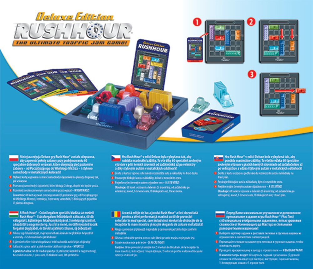 Hra Rush Hour v edici Deluxe byla vylepšena tak, aby nabídla maximální zážitky ze hry. To vše díky 60 speciálně zvoleným výzvám v pěti herních úrovních od začátečníků až po velmistry a díky stylovým autům v metalických odstínech! Posouvejte blokující auta a náklaďáky v pruzích nahoru a dolů, vpravo a vlevo, dokud neuvolníte cestu k úniku červenému autu. Vozidly lze pohybovat dopředu a dozadu, ale ne do stran. Obsahuje: 60 karet s výzvami a řešením (5 úrovní hry od začátečníka po velmistra), návod, 1 červené auto, 15 blokujících aut, 1 hrací deska.