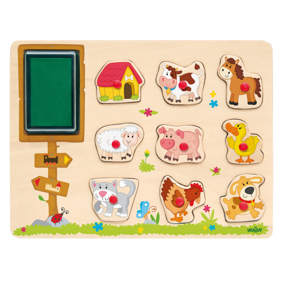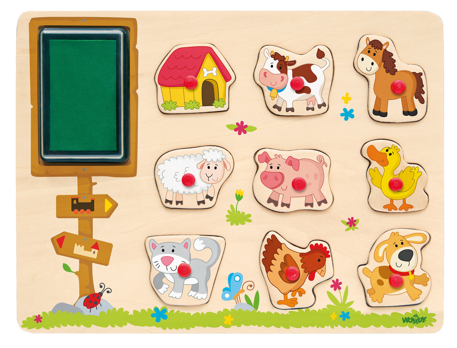 Kombinace razítek a puzzlí. Na spodní straně každého zvířátka je gumové tiskátko, pro které najdete přímo na ploše tohoto výrobku barevný polštářek. Děti si mohou vybarvovat natištěná zvířátka a skládat z nich celé obrázkové kompozice. Obsahuje 9 razítek| Věk: 2+ | Rozměr: 30 x 21 cm.