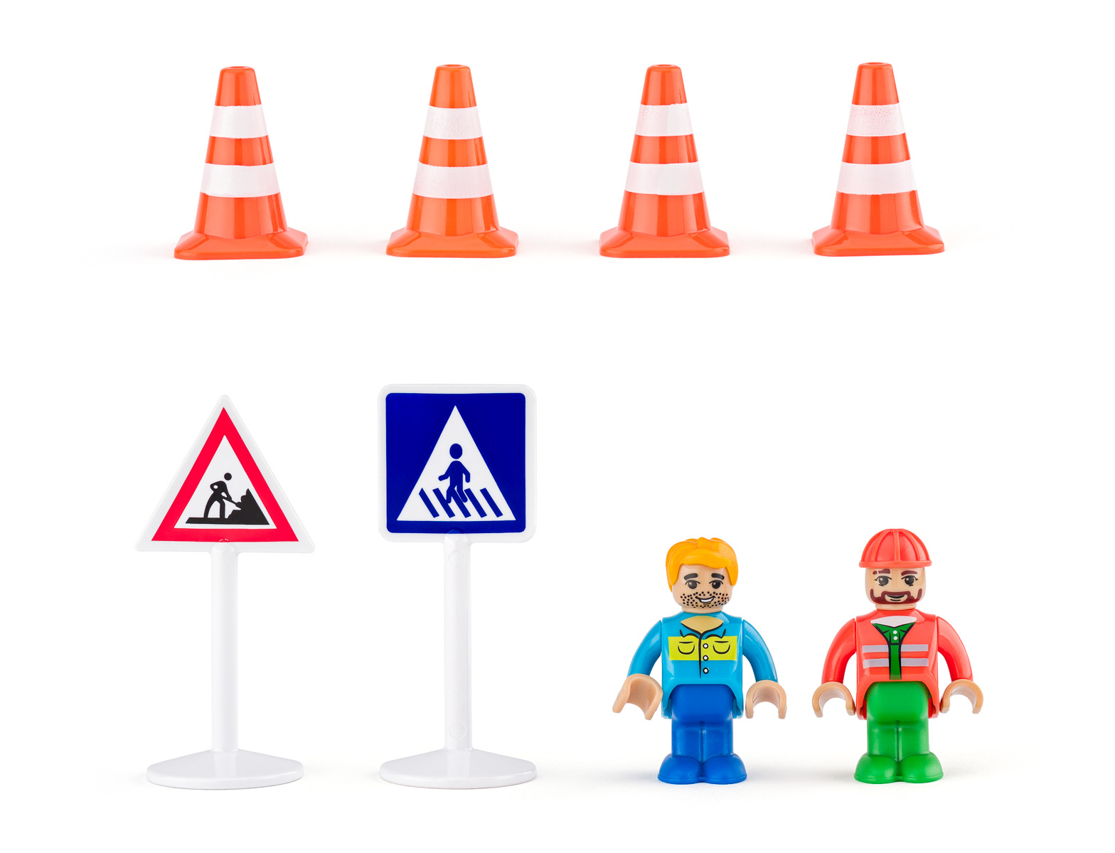 Dřevěná autíčka jako sada užitkových vozidel (pošta, popeláři, jeřáb, nákladní auto) doplněná o plastové doplňky a figurky s pohyblivými klouby.| Věk: 3+