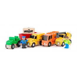 Dřevěná autíčka jako sada užitkových vozidel (pošta, popeláři, jeřáb, nákladní auto) doplněná o plastové doplňky a figurky s pohyblivými klouby.| Věk: 3+