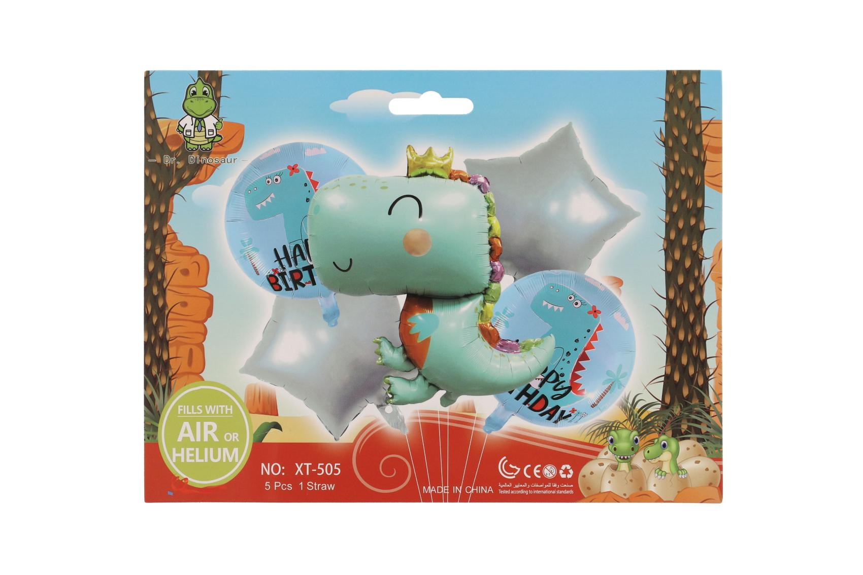 Veselá nafukovací sada balonků s motivem dinosaura potěší každého malého oslavence! Uvnitř balení najdete 5 kusů balonků v různých tvarech – včetně roztomilého dinosaura s korunkou, kulatých balonků s nápisem „Happy Birthday“ a dvou hvězd. Balonky jsou vhodné k plnění vzduchem i heliem a skvěle se hodí jako dekorace na dětskou narozeninovou oslavu.