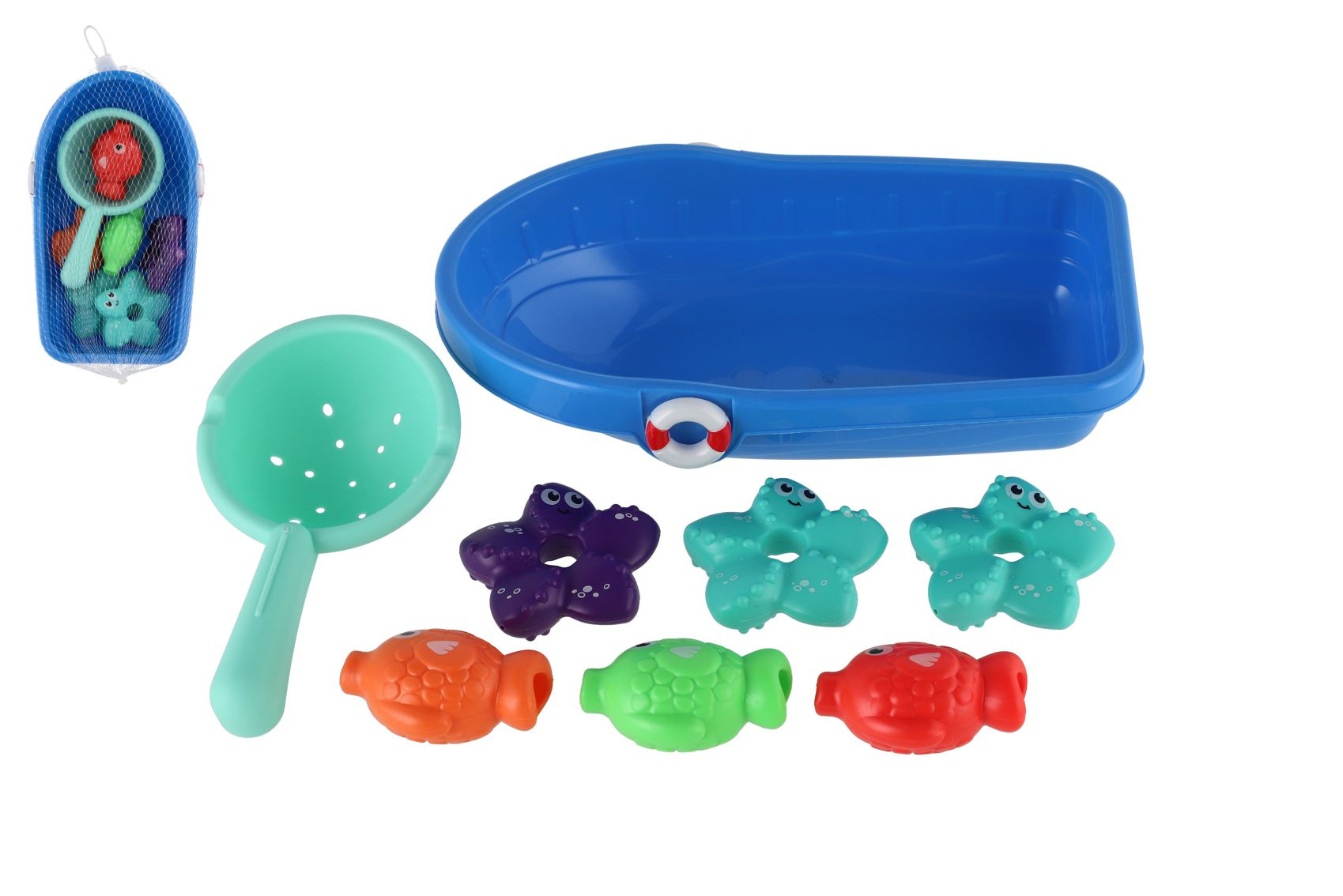 Popis Sada do vany plast lodička, sítko s mořskými zvířátky v síťce 14x24cm