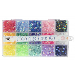 Úžasná sada obsahující 15 různých barev neonových drahokamů o průměru 6 milimetrů, dekorativní kamínky/diamanty jsou baleny v praktickém plastovém pořadači o velikosti 18x10 cm