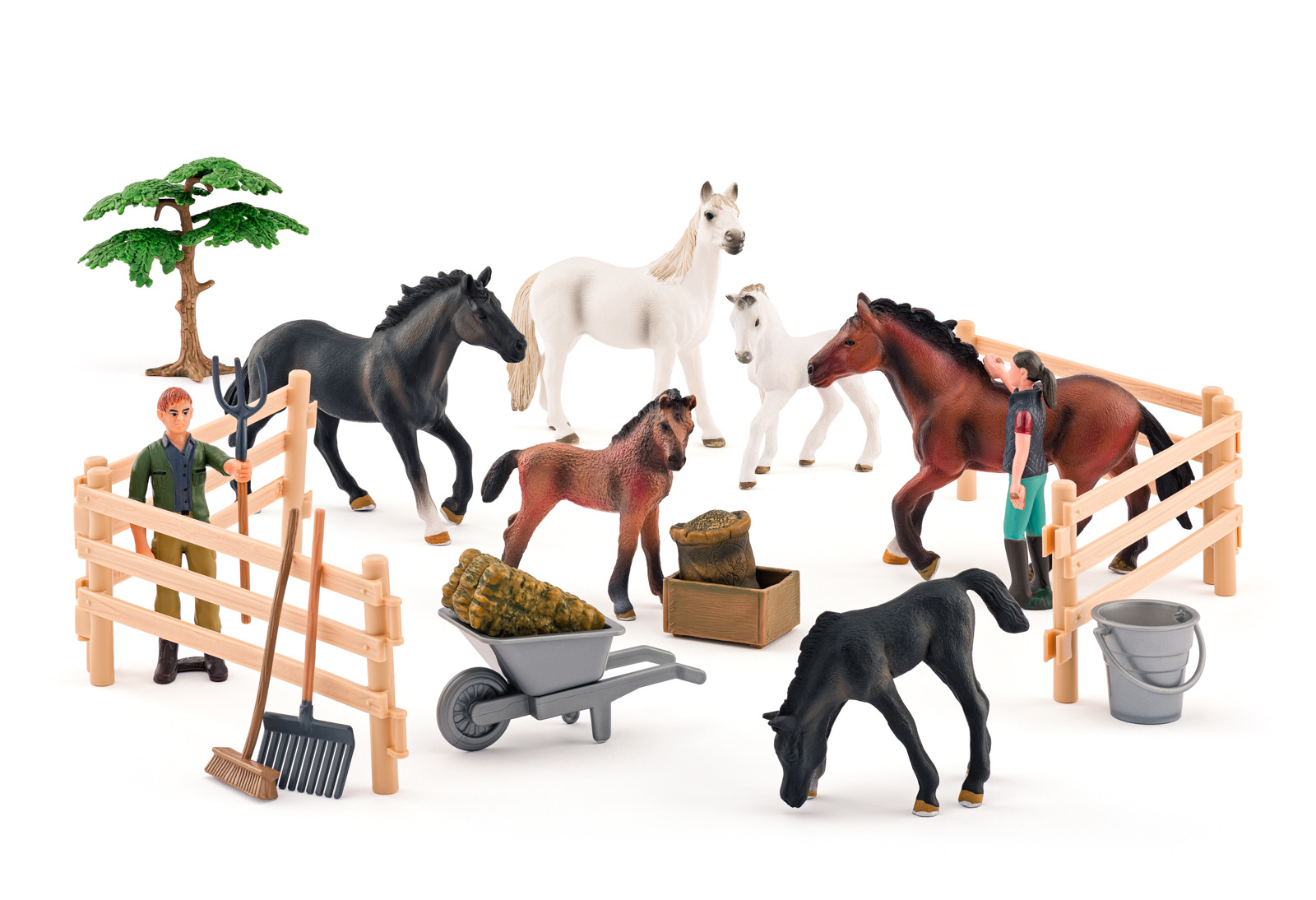 Krásná hrací sada, která je opravdu plná koní! Najdete v ní 3 dospělé koně a 3 hříbata, 2 ošetřovatele a spoustu dalšího příslušenství.| Počet figurek: 8 | Počet dílů: 25 | Věk: 3+ | Velikost koně:12 x 10 cm