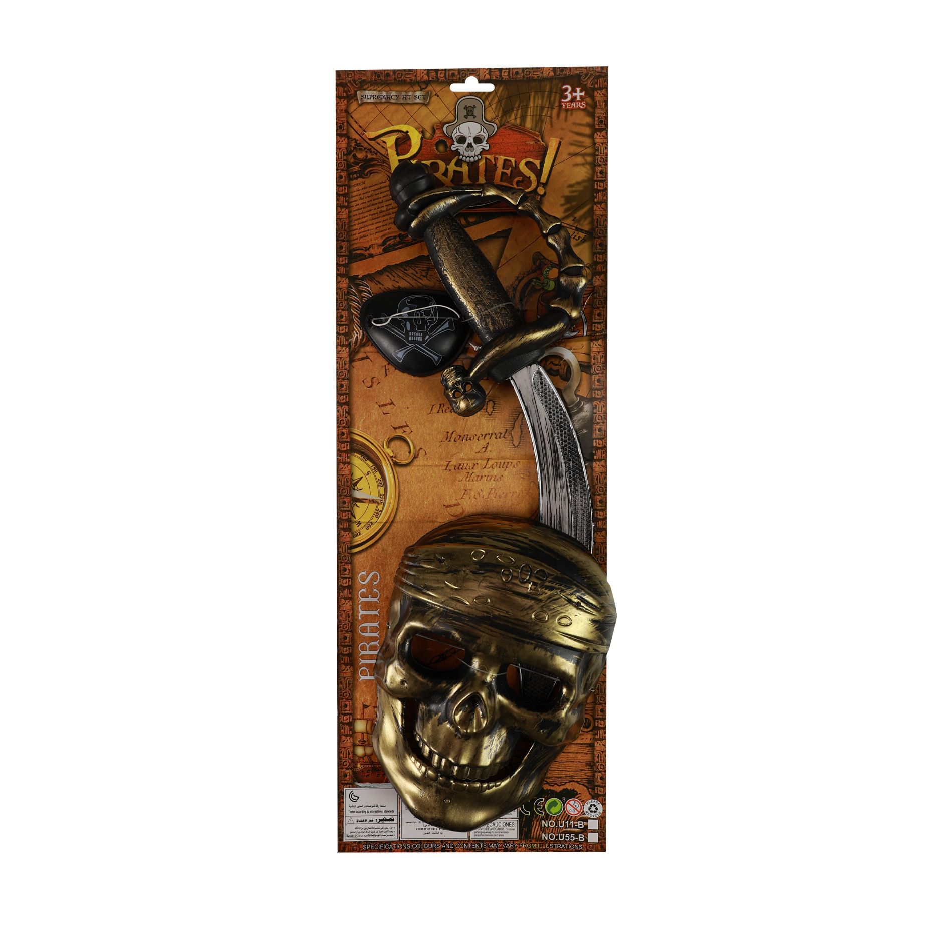 Exkluzivní sada pro všechny malé piráty! Tento parádní set obsahuje bronzovou masku na gumičku, klapku na oko a meč s bronzovou rukojetí. Tyto super doplňky jsou ideální k pirátskému kostýmu! Vše je vyrobeno z PVC.