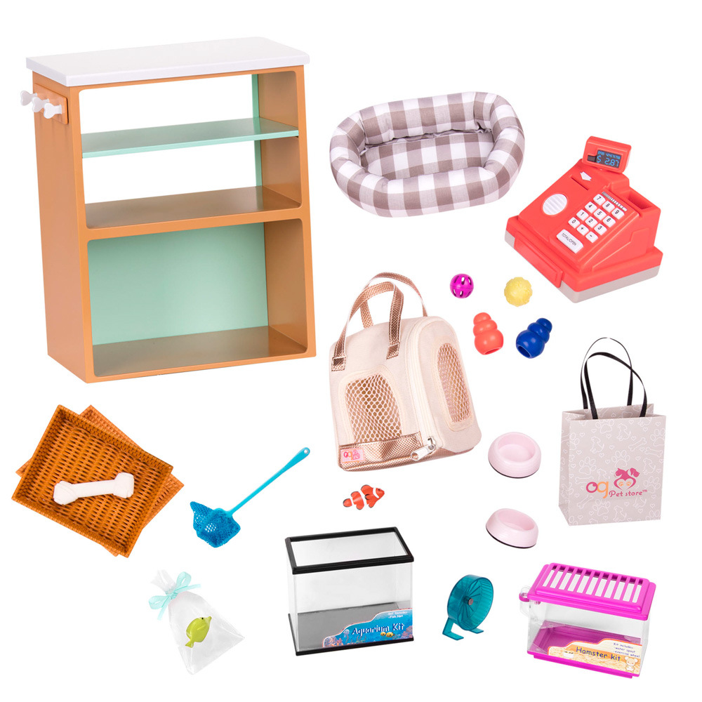Výrobek obsahuje: 1 pult, 1 pokladnu, 2 proutěné košíky, 2 misky pro domácí mazlíčky, 1 akvárium, 1 síťku na rybičky, 1 rybička, 1 rybička v sáčku, 1 klec na křečka s běhacím kolečkem, 1 nákupní taška, 2 hračky pro zvířátka, 1 míček na hraní pro zvířátka, 1 míček na hraní pro kočičky, 1 kost na hraní, 1 přenosnou tašku na domácí mazlíčky, 1 pelíšek pro psy. Panenky, štěně, oblečky a ostatní doplňky se prodávají samostatně. Rozměr balení: 43,18 x 38,1 x 11,43 cm. Věk: 3+