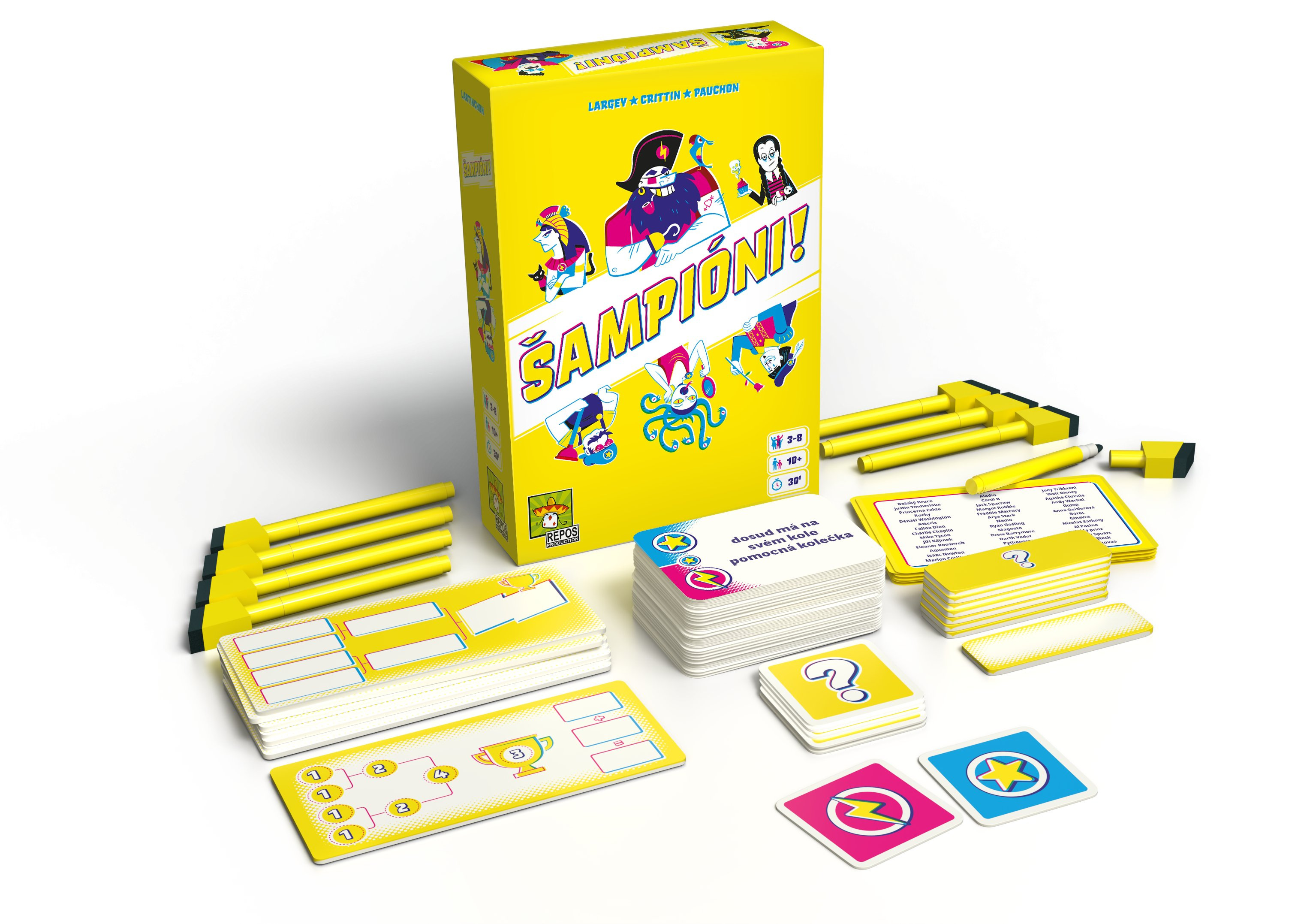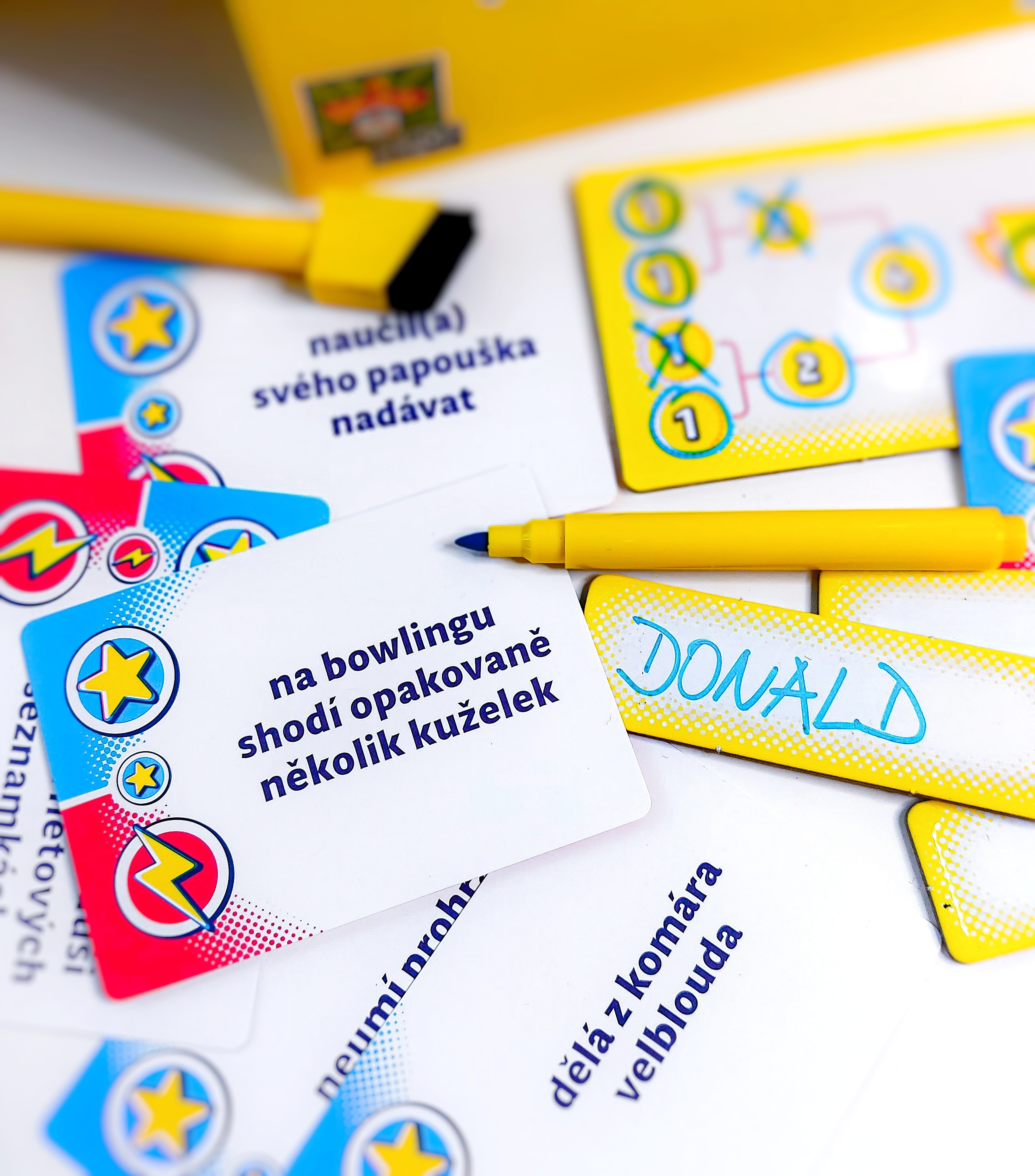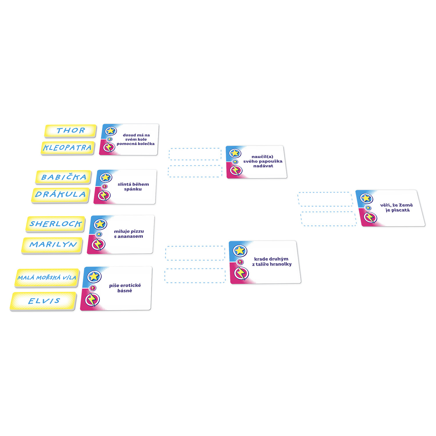 Obsah balení: 110 karet duelů 8 desek 16 hlasovacích karet (8 v každé barvě) 8 listů s postavami 8 mazatelných fixů 8 dílků Soutěžících česká a slovenská pravidla