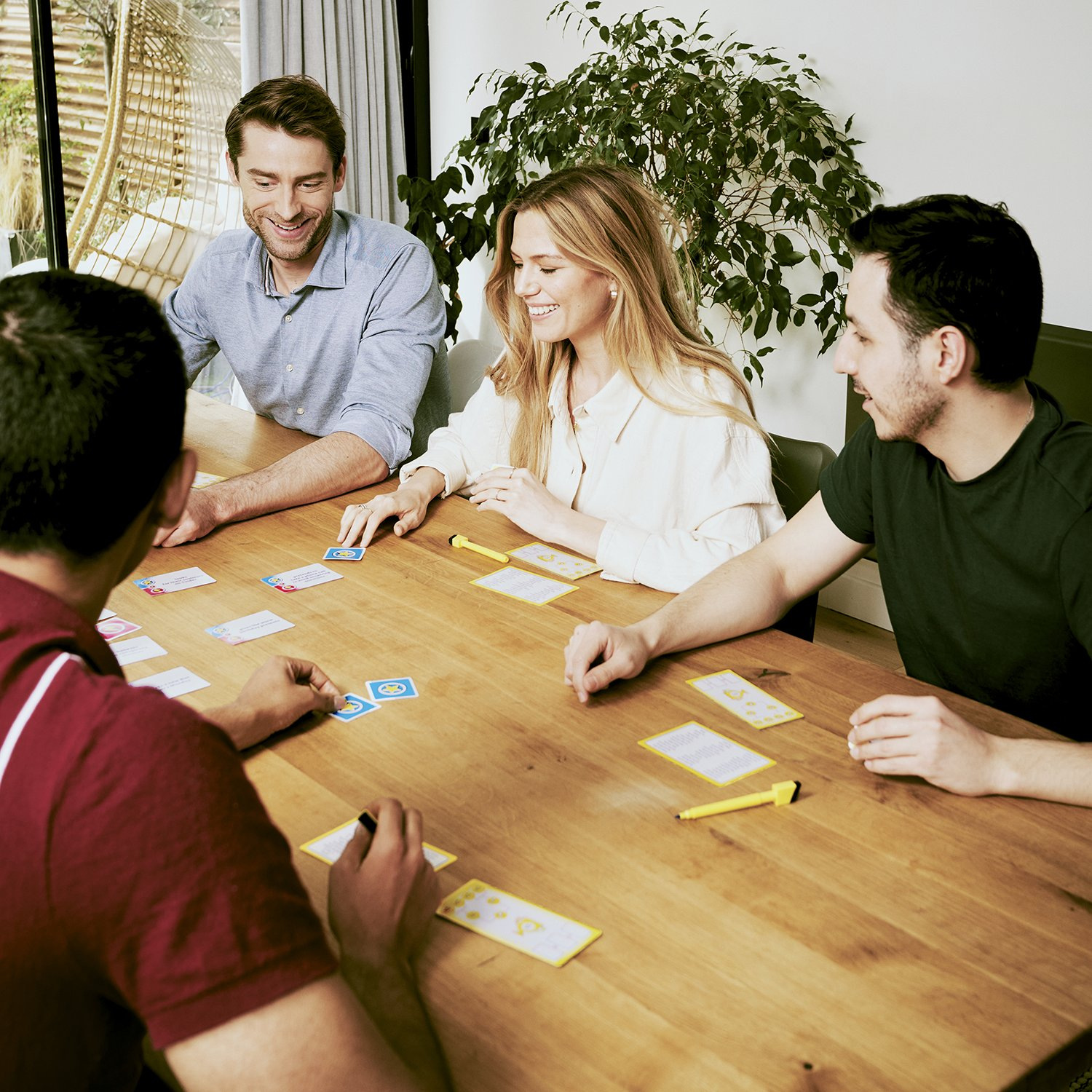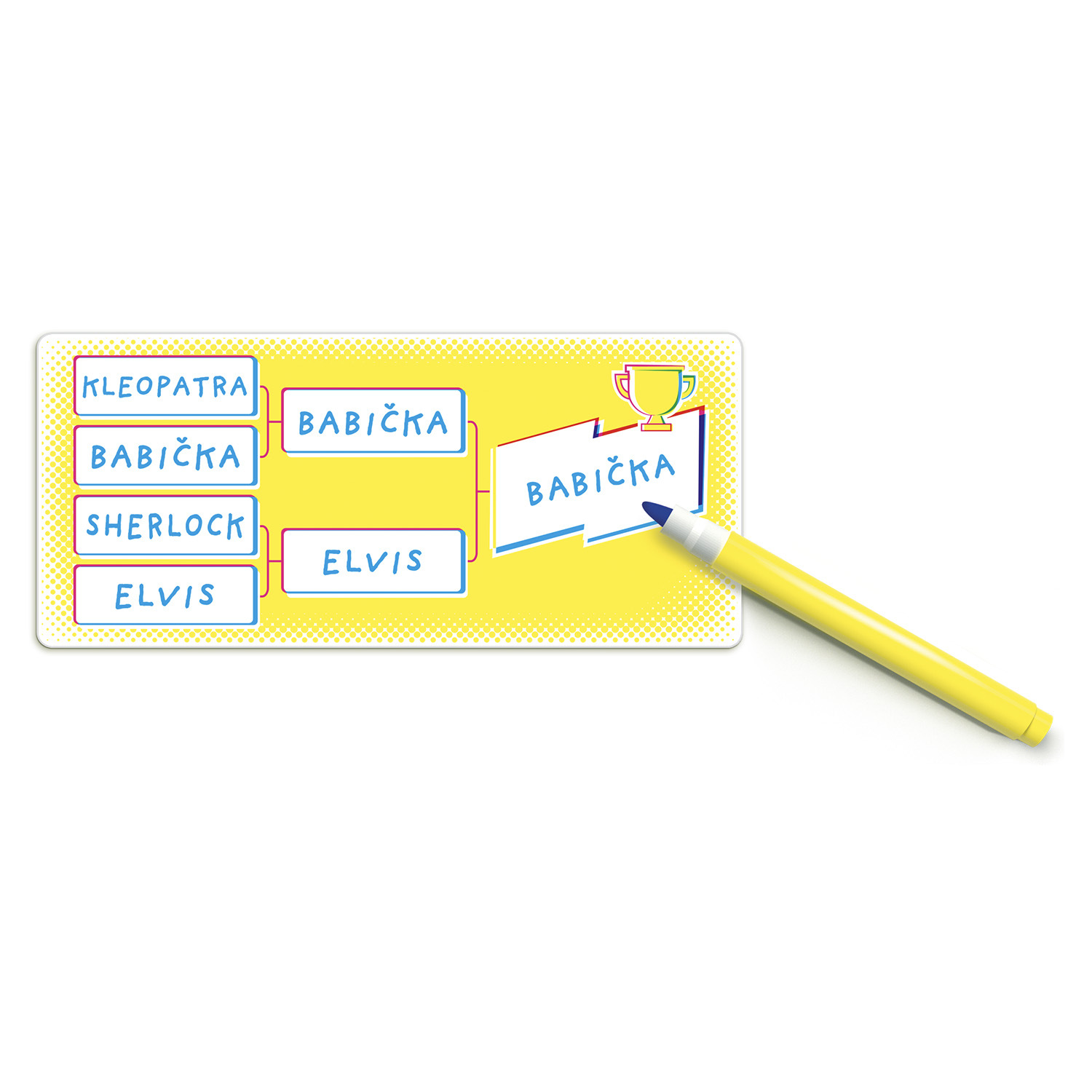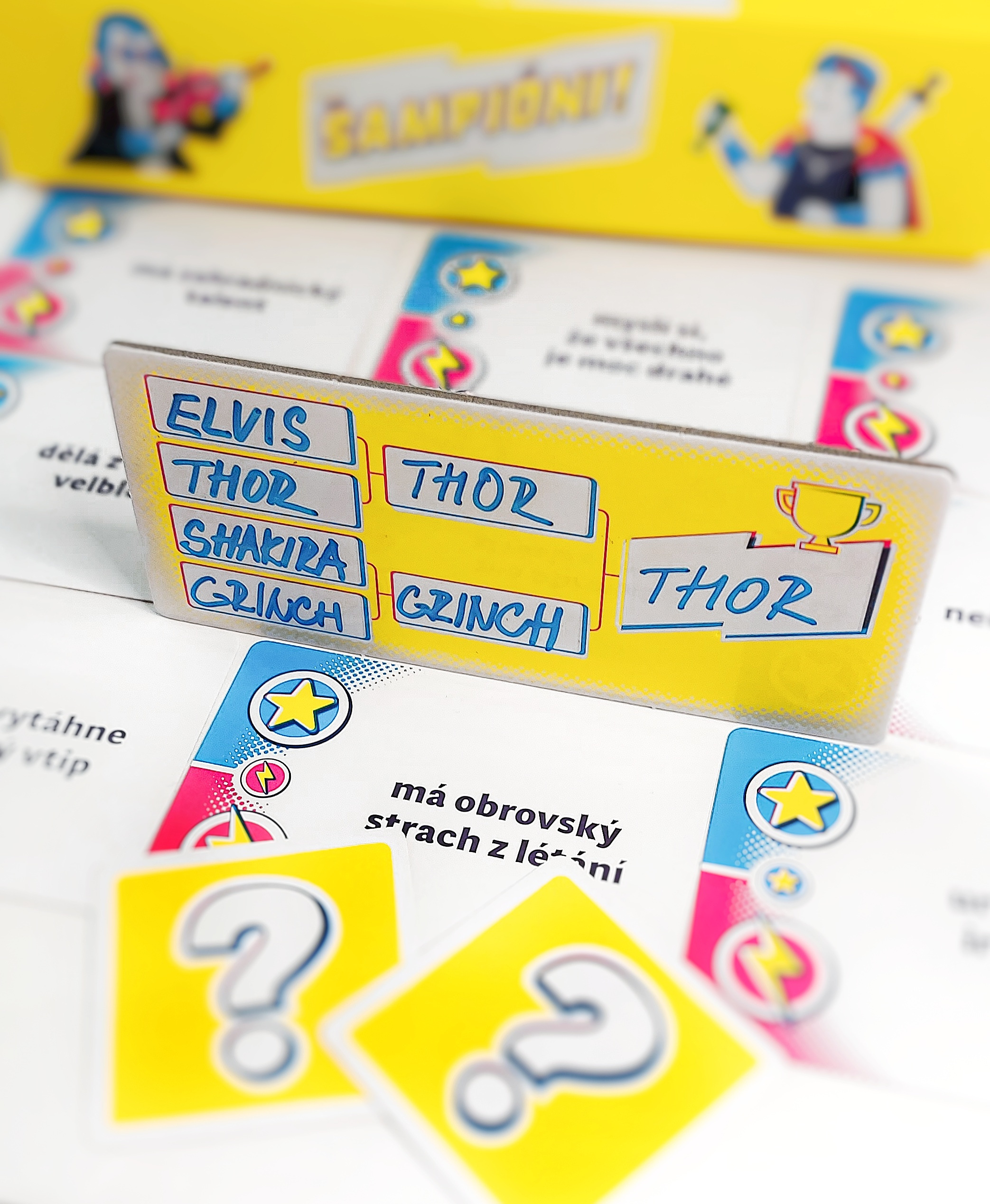 Obsah balení: 110 karet duelů 8 desek 16 hlasovacích karet (8 v každé barvě) 8 listů s postavami 8 mazatelných fixů 8 dílků Soutěžících česká a slovenská pravidla