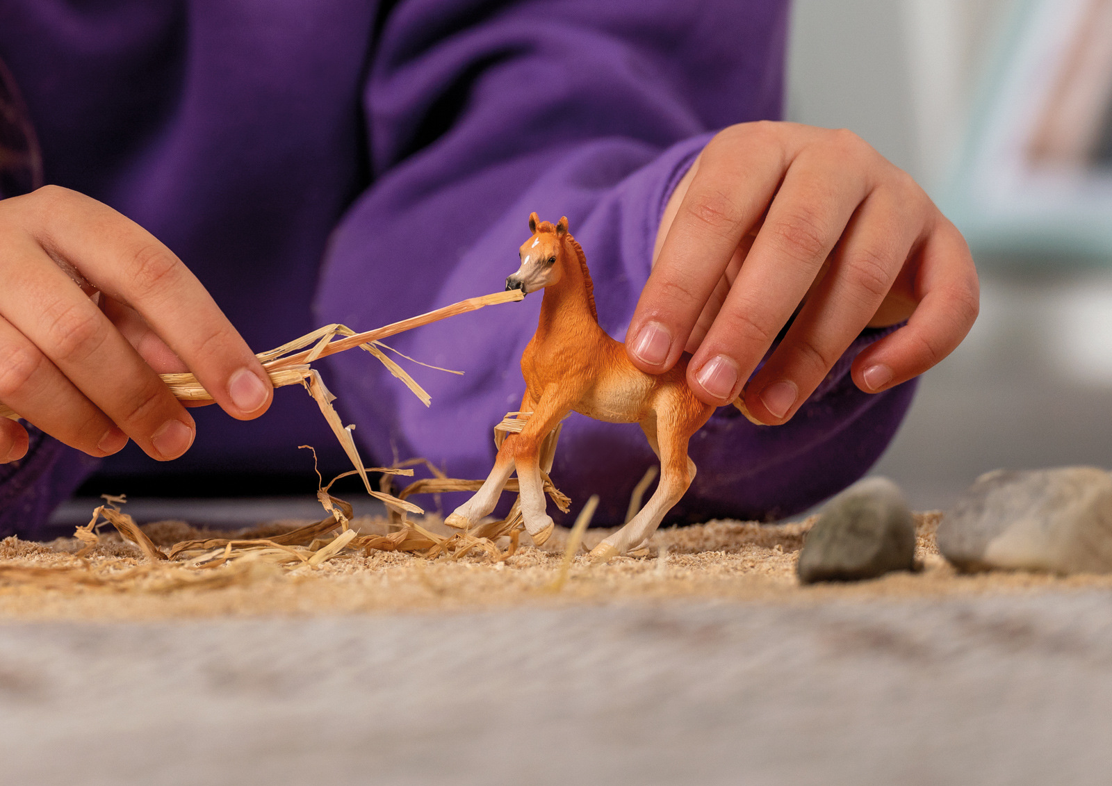 Něco se tam vzadu děje! Malé arabské hříbě si to rozhodně nechce nechat ujít! Přestože pochází z nejušlechtilejšího chovu, malý plnokrevník nemá nejmenší chuť chovat se jako šlechtic. Naopak, arabské hříbě je nesmírně zvědavé a hravé. Proto pozorně stříhá ušima a už klusá za dobrodružstvím. Na dlouhých nohách cválá po pastvině. Vypadá tak ladně, že se z něj jednou určitě stane úspěšný dostihový kůň. Rozměry figurky: 8 x 8 x 2 cm. Věk: 5+