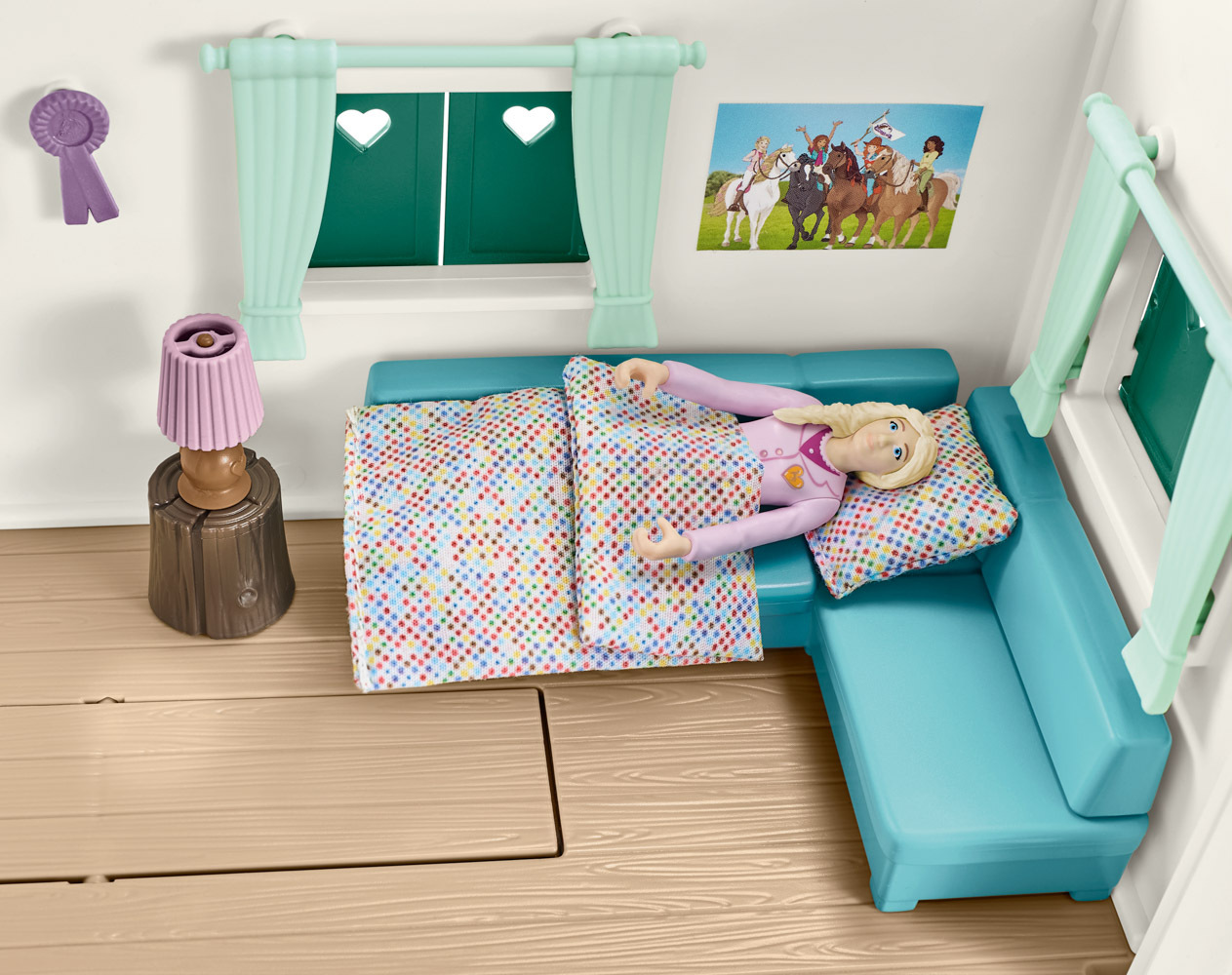 Za hodinu se dostav na tajné místo setkání… Kde by to jen mohlo být? Samozřejmě v karavanu z kolekce Schleich® HORSE CLUB! Je ideální pro pořádání tajných schůzek. Když chceš například naplánovat večírek s překvapením pro kamaráda v jezdecké stáji. Nebo malovat jezdecké klobouky. Je to také ideální místo pro společné posezení na střešní terase v létě nebo na pohovce v zimě. Jako každé správné velitelství má i karavan speciální tajnou přihrádku. Musíš si však sám zjistit, kde se schovává a co v ní je. Nebo už to víš? Sada obsahuje: 1× plně pohyblivá figurka, 1× andaluská klisna, 1× veverka, 1× stáj, 2× lucerna, 1× žebřík, 1× židle, 1× slunečník, 1× venkovní stolek, 1× pohovka, 1× stolek do obývacího pokoje, 1× lampa, 1× okenní truhlík, 1× provazový žebřík, 2× ocenění pro vítěze, 1× sedlo, 1× uzda, 1× otěže, 1× ohlávka, 1× stojan na seno, 1× hřeben, 1× kartáč na hřebelcování, 1× balík slámy, 1× kbelík, 1× jablko, 2× polštář, 1× ohniště, 1× láhev, 2× vidlice na opékání s klobásou, 2× hrne