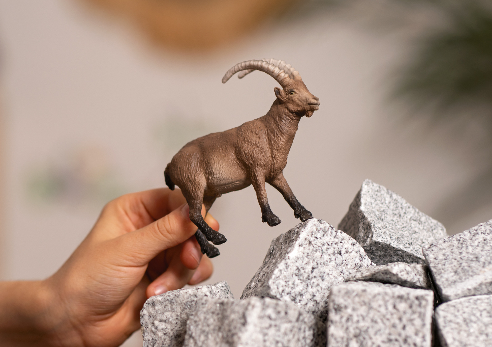 Obratně šplhá nahoru a dolů mezi vysokohorskými skalami. Opatrně nastavuje svá jemná kopyta a sleduje stopu, takže se dokáže bez námahy pohybovat náročným terénem Alp. Jistěji než kterýkoli jiný zdejší savec. Snadno se vyškrábe až do výšky 3 500 metrů! Když však dostane hlad, obvykle z těchto velkých výšek opět sestupuje, protože šťavnaté alpské louky s chutnými bylinami jsou obvykle níž. Rozměry figurky: 3,2 x 9,2 x 4,6 cm. Věk: 3+