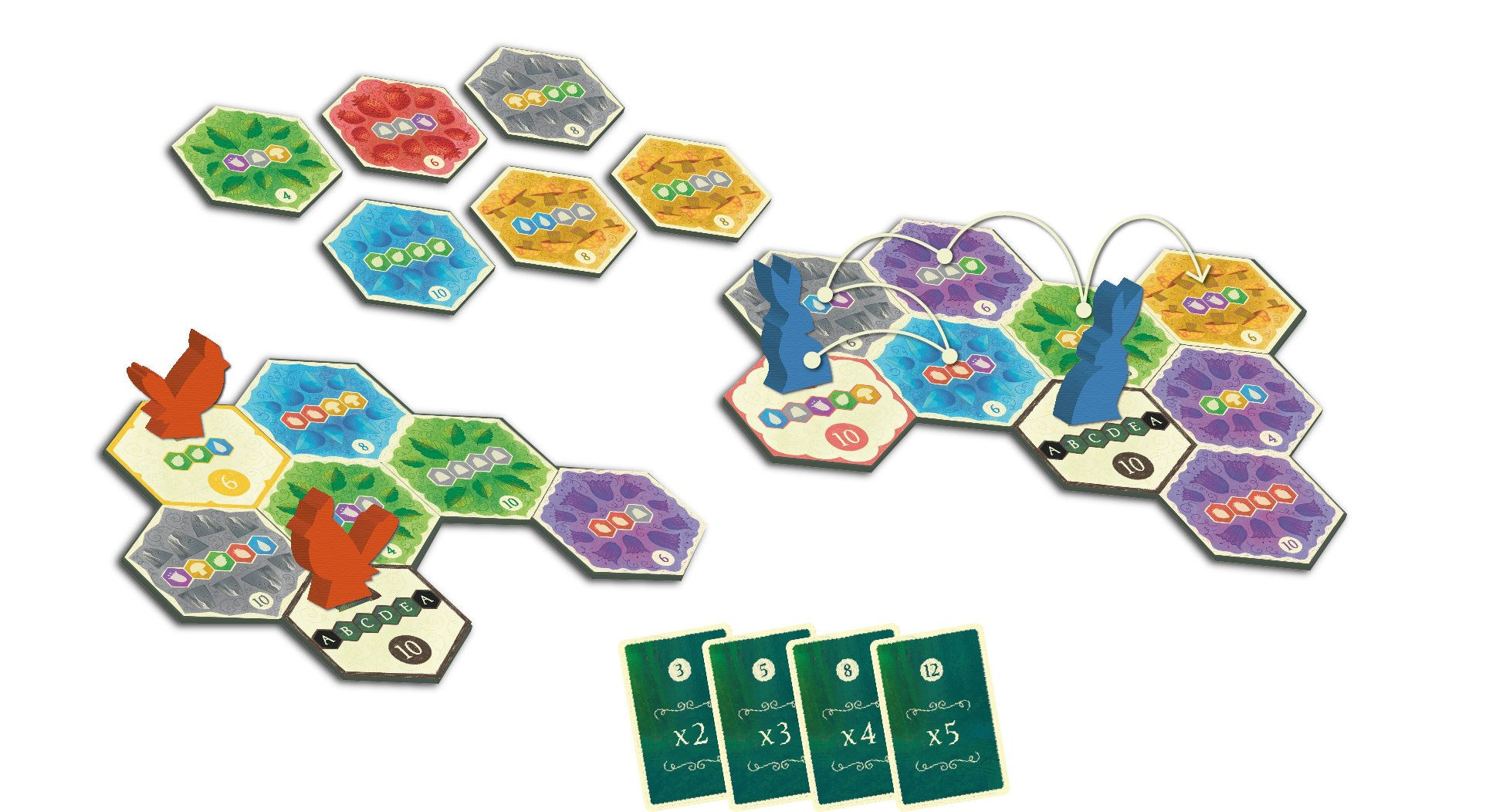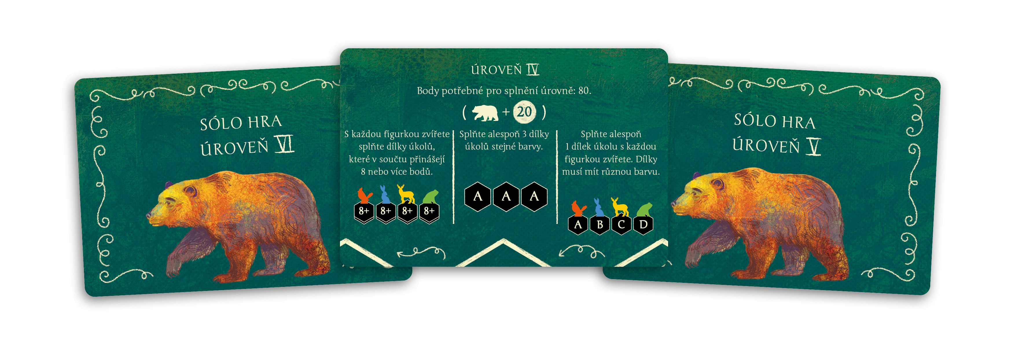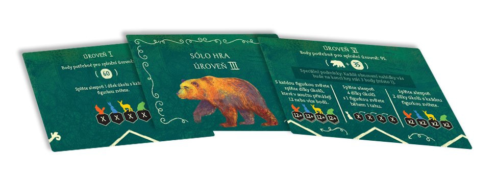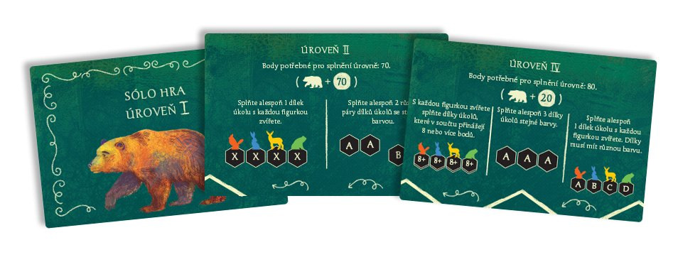 Obsah balení: 1 látkový pytlík 104 dílků 16 figurek zvířat 1 žeton začínajícího hráče / sólového režimu 10 kombo karet 1 deska pro sólový režim 6 karet výzev pro sólový režim česká pravidla