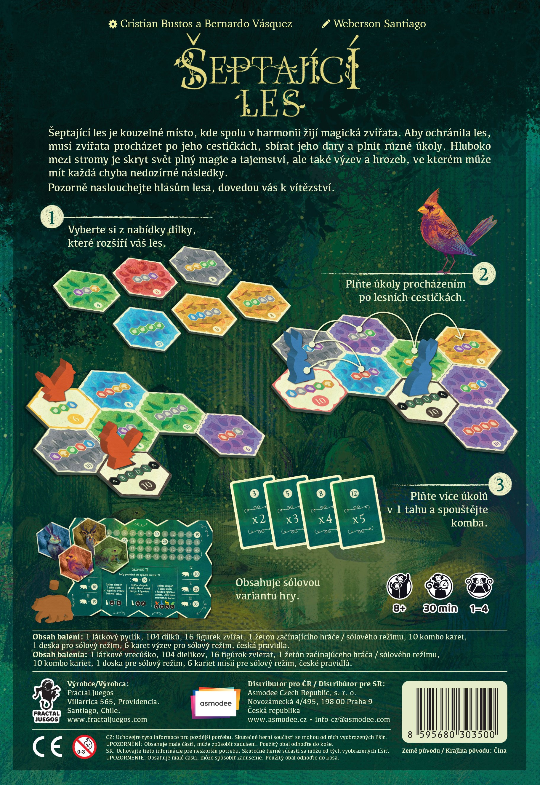 Šeptající les je kouzelné místo, kde spolu v harmonii žijí magická zvířata. Aby ochránila les, musí zvířata procházet po jeho cestičkách, sbírat jeho dary a plnit různé úkoly. Hluboko mezi stromy je skryt svět plný magie a tajemství, ale také výzev a hrozeb, ve kterém může mít každá chyba nedozírné následky. Rozšiřujte svůj les a s rozmyslem plánujte pohyb po lesních cestičkách. Jste připraveni vstoupit do jeho hlubin a odhalit jeho tajemství? Naslouchejte pozorně šepotu, který vás dovede k vítězství.