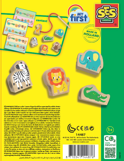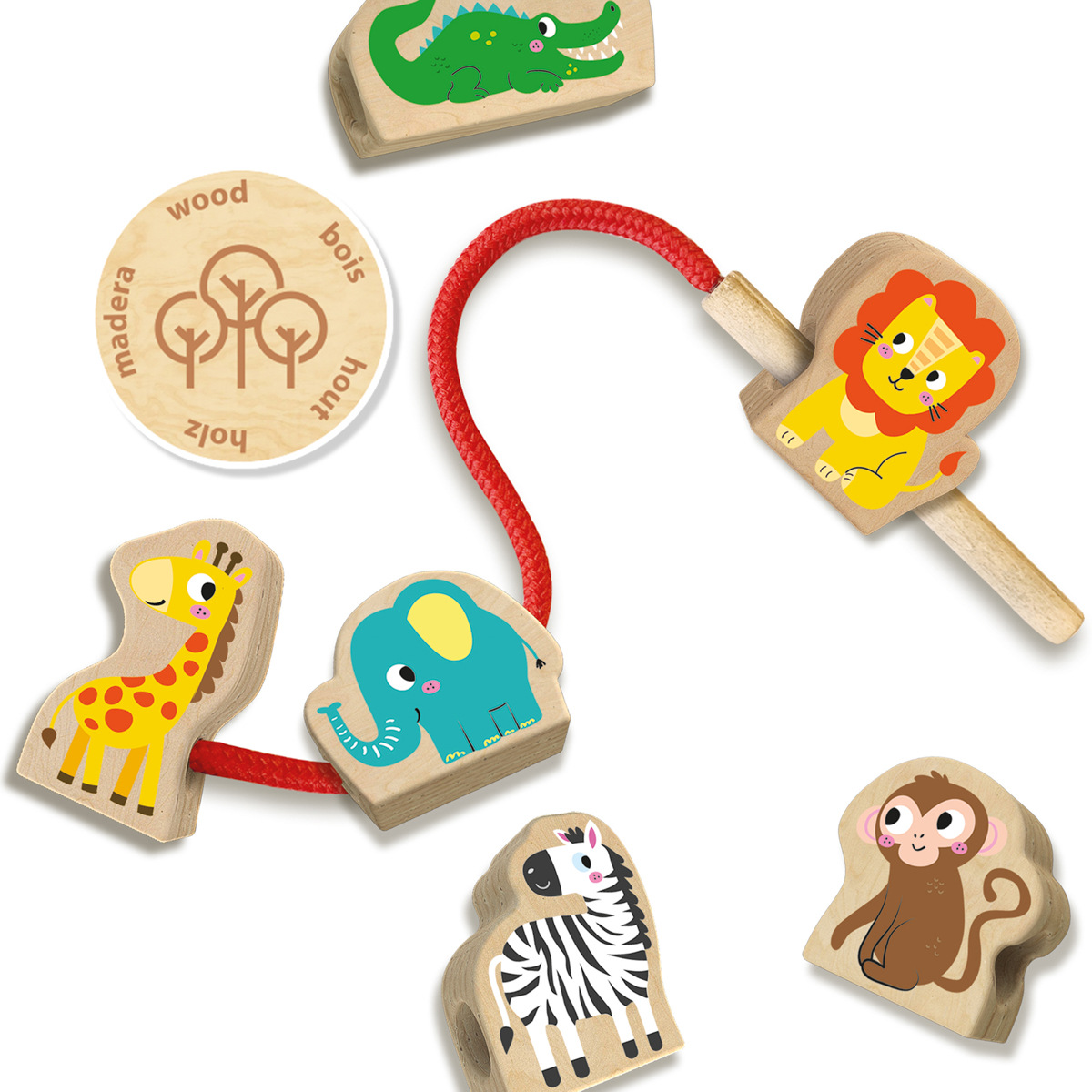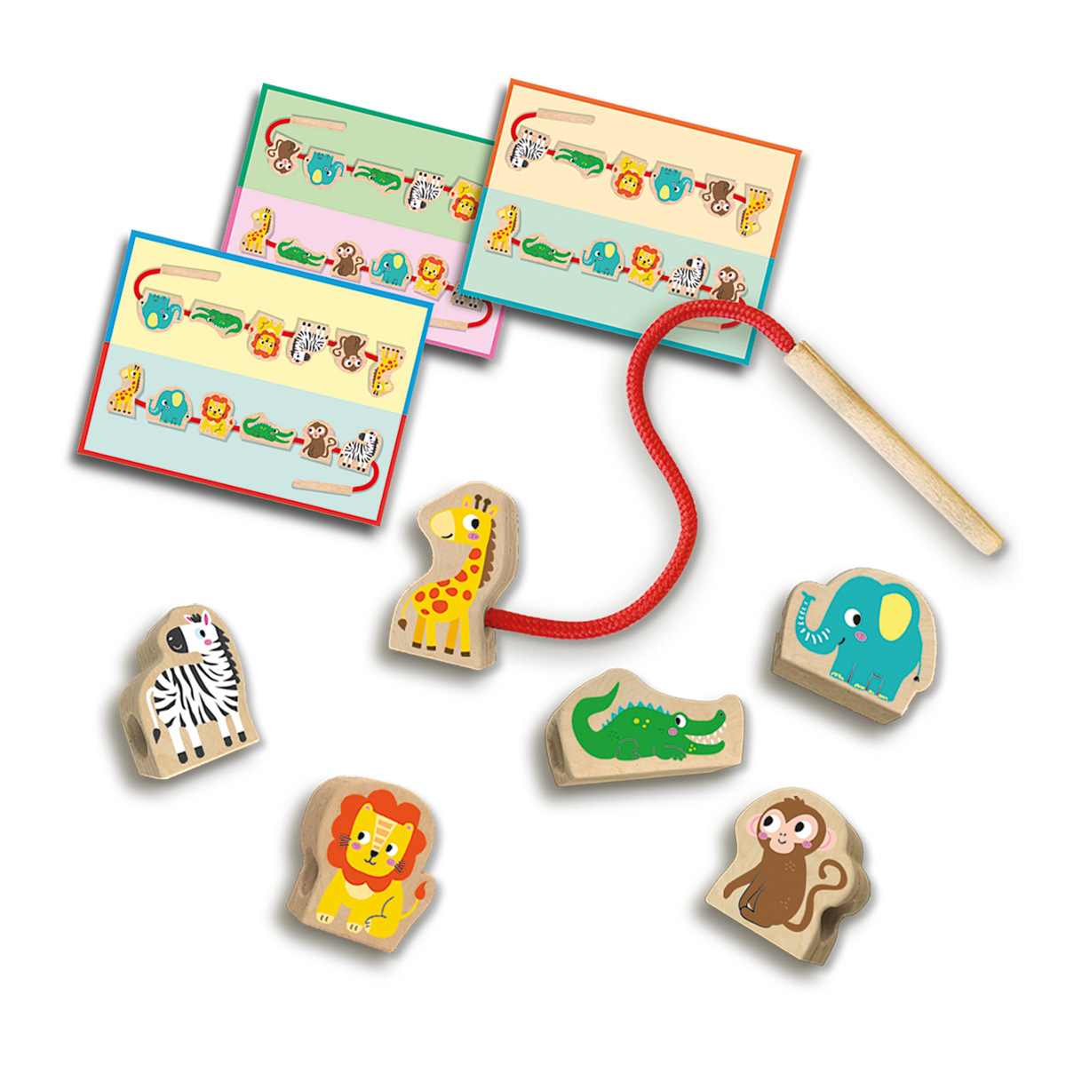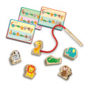 Dokážete navléknout roztomilá zvířátka ve správném pořadí na korálkový náhrdelník? Tvary jsou vyrobeny ze skutečného dřeva a lze je navlékat ve správném pořadí pomocí karet s pokyny. Dokážete vytvořit všech šest příkladů? Žirafa je připevněna na šňůrce, takže ostatní korálky nesklouzávají a s dřevěnou jehlou je navlékání mnohem jednodušší. Stimuluje kreativitu, napomáhá rozvoji jemné motoriky a manuální dovednosti navlékání. Obsahuje: Navlékací šňůrku s nasazenou dřevěnou jehlou a pevným zvířecím korálkem, 5 korálků, vzorové karty. Rozměry balení: 20 x 15 x 4 cm. Věk: 1+