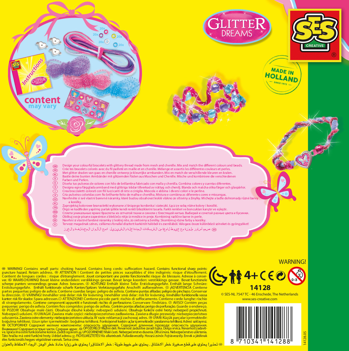 Kompletní sada pro výrobu krásných třpytivých náramků s motivem princezen – nesmí chybět v dívčí kreativní výbavě. Díky třpytivému drátku a žinylce si můžete samy navrhnout ty nejkrásnější náramky. Drátek a žinylku můžete použít různými způsoby – kroucení, splétání, uzlování, prostě to vyzkoušejte. Kombinujte různé barvy a korálky, přidejte přívěsky a získejte si pozornost. Obsahuje: 4 barvy žinylky, 3 barvy třpytivého drátku, 5 barev korálků, přívěsky, samolepky a návod k použití. Baleno v krabičce. Rozměry balení: 20 x 20 x 4 cm. Věk: 4+