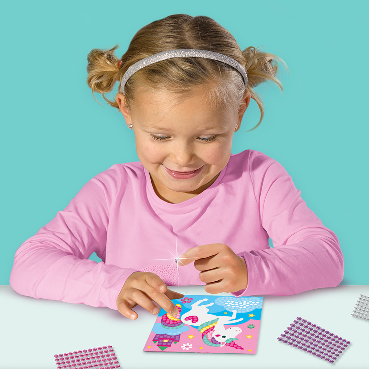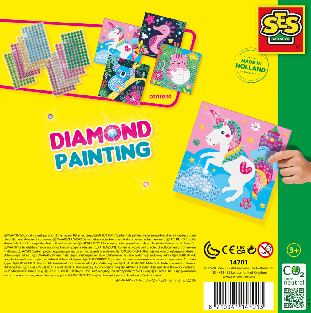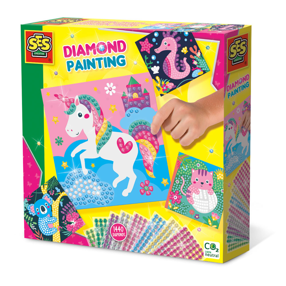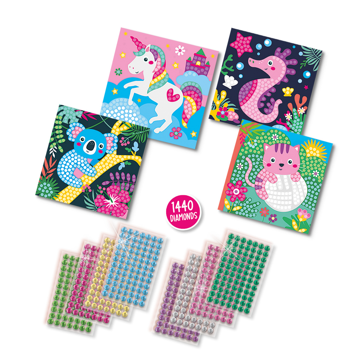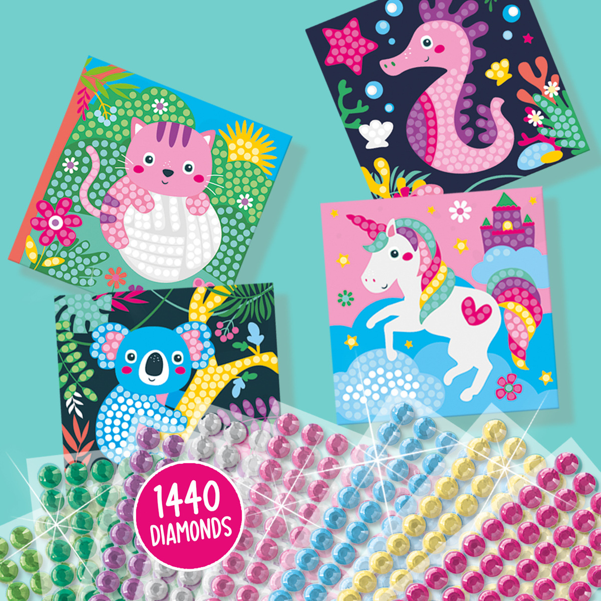 Diamantové malování – Veselá zvířátka. Kreativní sada, se kterou vytvoříte veselá umělecká díla plná barev a třpytu. Ozdobte kartičky s roztomilými zvířátky barevnými diamantovými kamínky a sledujte, jak ožívají. Děti lepí diamantové mozaikové kamínky na bílá políčka karet a vytvářejí tak nádherné vzory. Je to jednoduché, zábavné a vždy to přináší krásný výsledek, na který mohou být pyšné. Podporuje rozvoj jemné motoriky, koncentraci a kreativitu. Obsah sady: 4 karty se zvířátky – jednorožec, koala, kotě a mořský koník, 1440 diamantových mozaikových kamínků v 8 barvách. Kamínky jsou samolepící. Baleno v krabičce. Rozměry balení: 20 x 20 x 4 cm. Věk: 3+