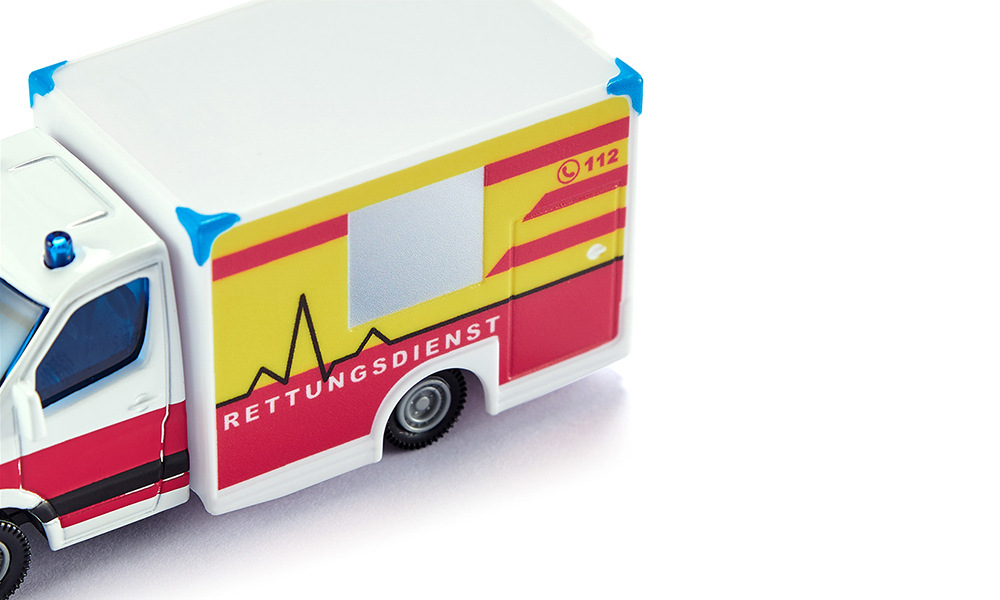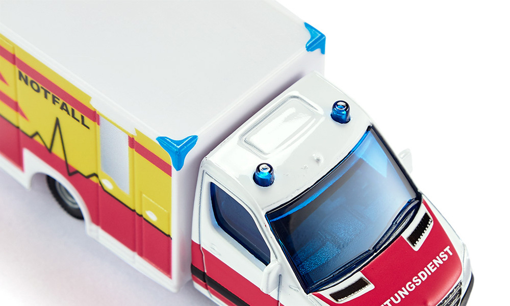 Jakmile je přijat hovor v centru pro tísňové volání, ihned vyjíždí SIKU Blister – Ambulance s blikajícími světly a signalizační houkačkou. Každá vteřina je rozhodující. Ambulance rychle přijíždí k nehodě. Vozidlo ambulance je sestaveno z vozu Mercedes-Benz Sprinter. Model je vyroben jako věrná kopie skutečného automobilu a disponuje mnoha propracovanými detaily. Věk: 3+. Rozměr balení: 9,7 x 8,7 x 3,7 cm
