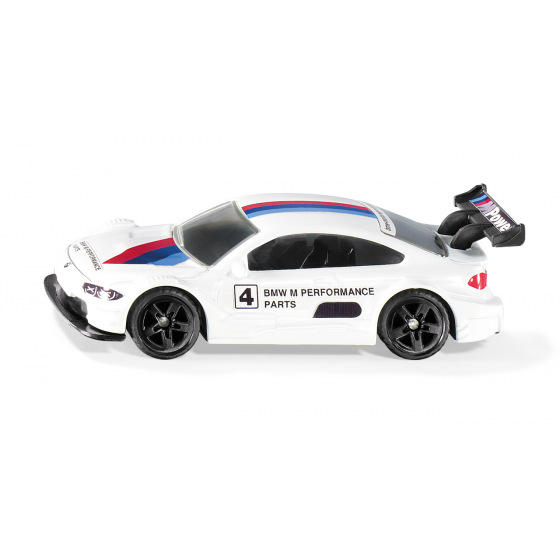SIKU Blister – BMW M4 Racing 2016. BMW M4 Racing s osmiválcovým motorem s pohonem na zadní kola a až 480 HP vyhrál v domácích závodech v mnoha sériích. Výkonný zadní spoiler zajišťuje přítlak dolů. V bílém barevném provedení s červeným pruhem a dvěma modrými pruhy. Rozměr balení: 9,7 x 7,8 x 3,7 cm. Věk: 3+
