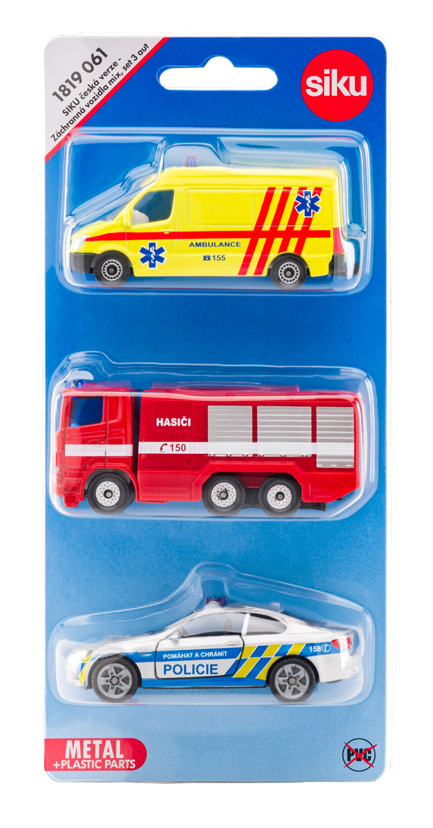 SIKU sada záchranných vozidel v české verzi. Tyto modely SIKU se vyznačují realistickými detaily a jsou vyrobeny z tlakově litých kovových a plastových komponentů. Sada obsahuje tři vozidla: Velký hasičský vůz, Ambulance dodávka a Policie osobní automobil BMW M3 coupé. Baleno v blistru. Rozměry balení: 7,8 x 19,7 x 3,8 cm. Věk: 3+