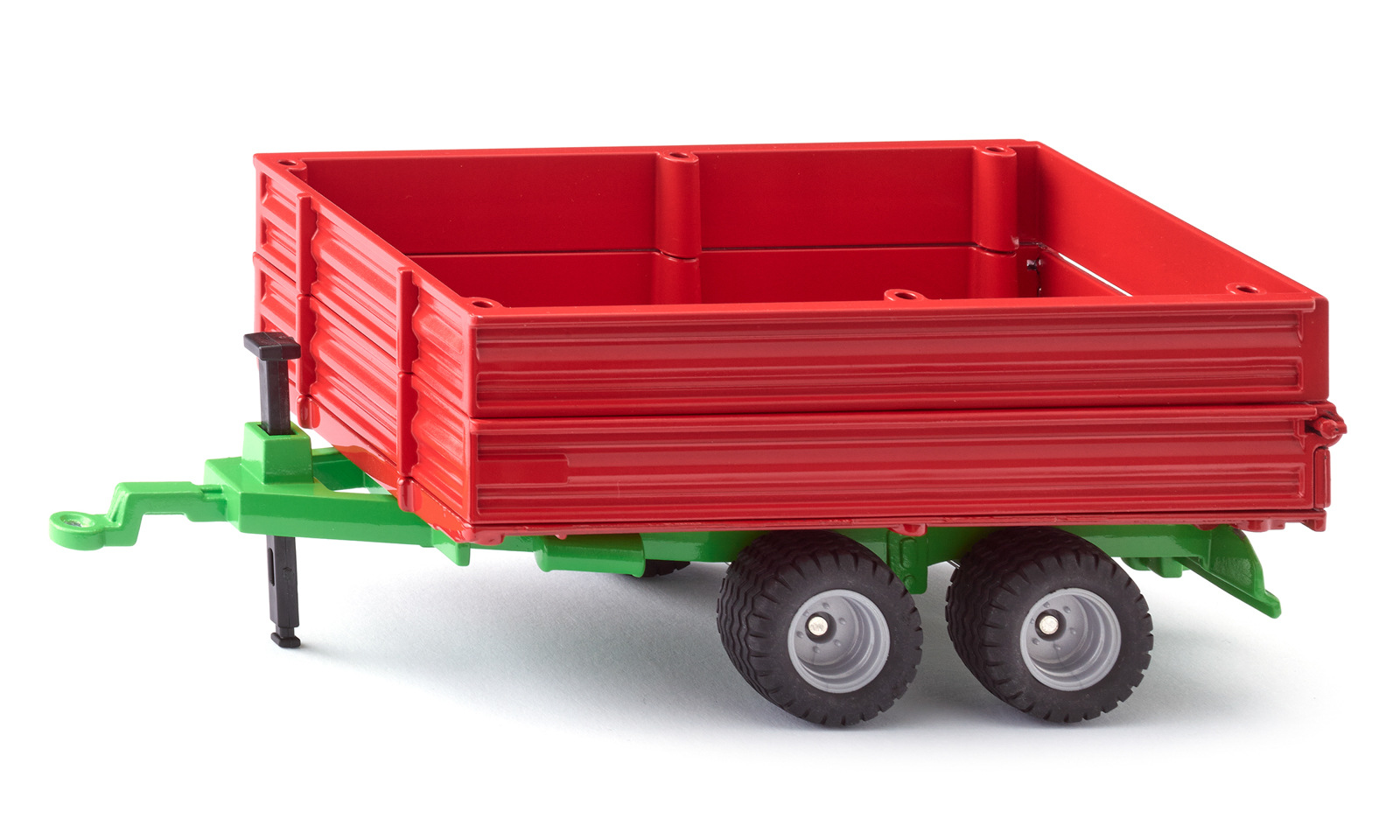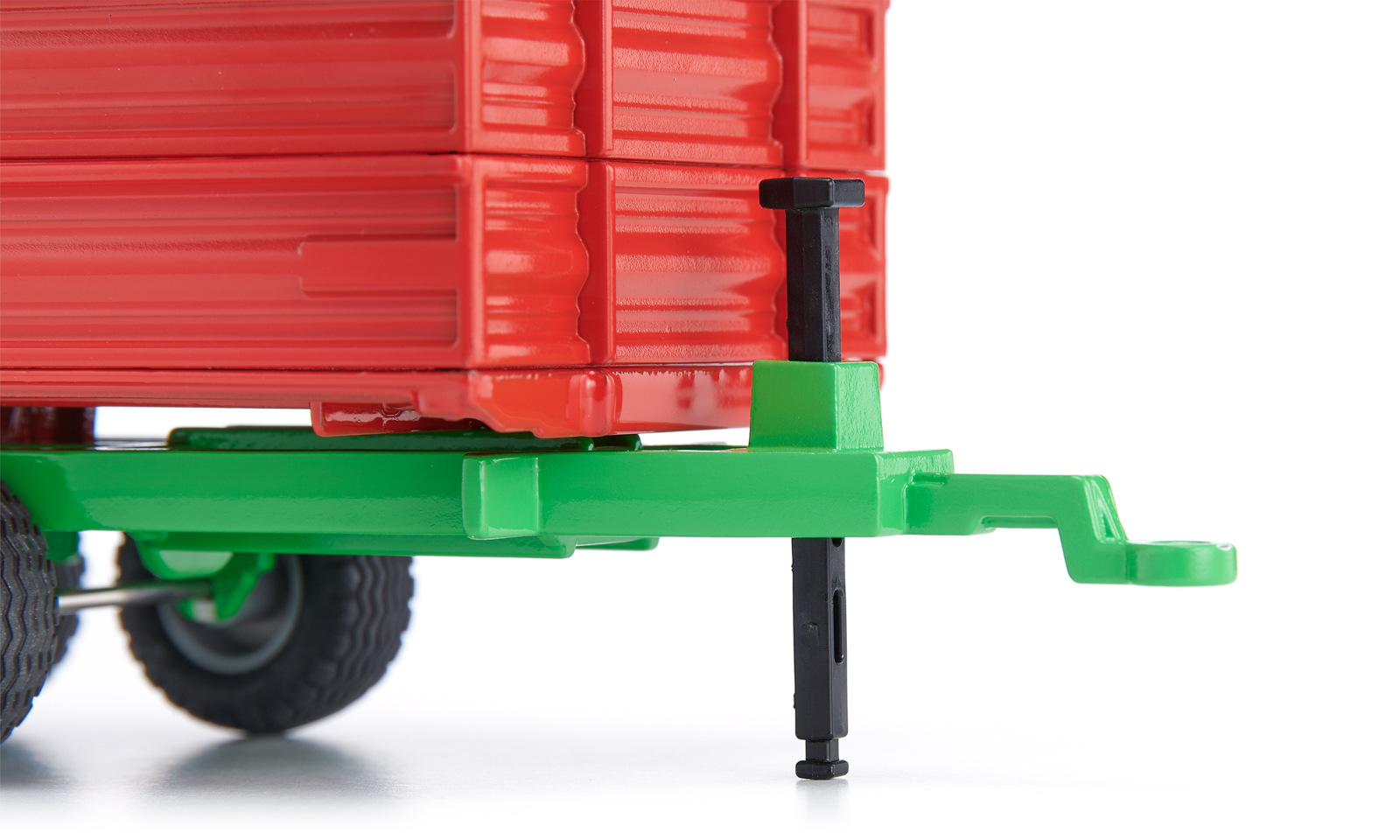 Přívěs za traktor v měřítku 1:32. Dvouosé středové otočné talířové přívěsy jsou nezbytnou součástí pracovního zařízení při farmářských pracích a sklizni. Přívěs je vybaven kovovým podvozkem a sklopným plastovým žlabem. Pravá bočnice lze otevřít. Funkce sklopení je umístěna na pravé straně. Spojka přívěsu umožňuje spojit dva z těchto přívěsů jako sběrný tým. Rozměr balení: 115 x 210 x 82 mm. Rozměr: 185 x 69 x 91 mm. Věk: 3+