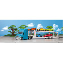 SIKU Super - Kamion s vlekem je detailně propracovaná kopie v měřítku 1:87. Podle nejnovějších bezpečnostních předpisů, mohou být sypké materiály přepravovány kamionem pouze pokud jsou zakryty plachtou. SIKU tuto nejnovější regulaci přenáší i a na své modely. Mercedes Actros táhne 3-osý návěs s pohyblivým sklápěčem a odnímatelnou plachtou vyrobenou z pružného plastového materiálu sloužící jako střecha. Zadní klapka na sklápěči je pohyblivá. Otevírá se vždy a je jedno, jestli je plachta nasazená nebo není. Rozměr: 156 x 34 x 45 mm. Rozměr balení: 21 x 5,4 x 7,5 cm. Věk: 3+