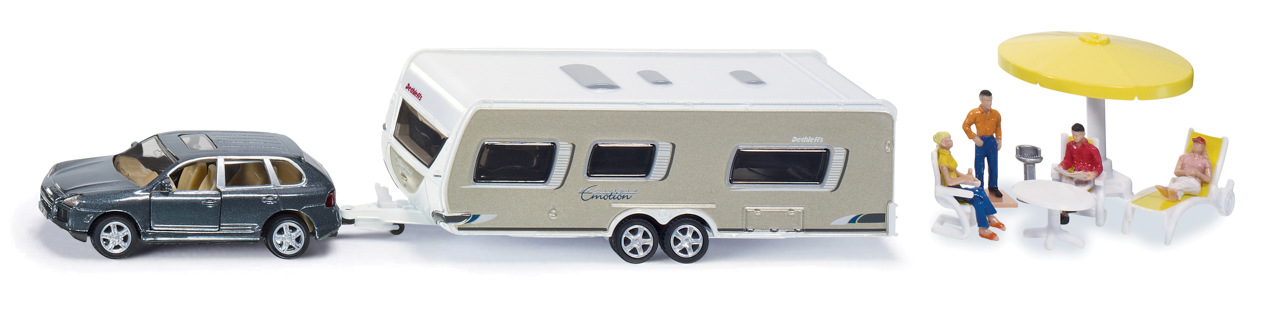 Sada s Porsche Cayenne Turbo jako tažné auto a "Exclusive Emotion" karavan od firmy Dethleff tvoří nepřehlédnutelný komplet. Porsche Cayenne je vypracován do jemných detailů a karavan s mnoha funkcemi a velkým množstvím nápisů dotváří dobrý pocit z tohoto modelu. Karavan má odnímatelnou střechu, takže můžete bez problémů nahlédnout dovnitř a hrát si s figurkami, které jsou součástí sady. Karavanu, stejně jako modelu Porsche, se otevírají dveře. Sada také obsahuje čtyři figurky, dvě židle, stolek, lehátko, gril a slunečník. Rozměr: 228 x 44 x 47 mm. Rozměr balení: 25,5 x 5,9 x 11,5 cm. Věk: 3+
