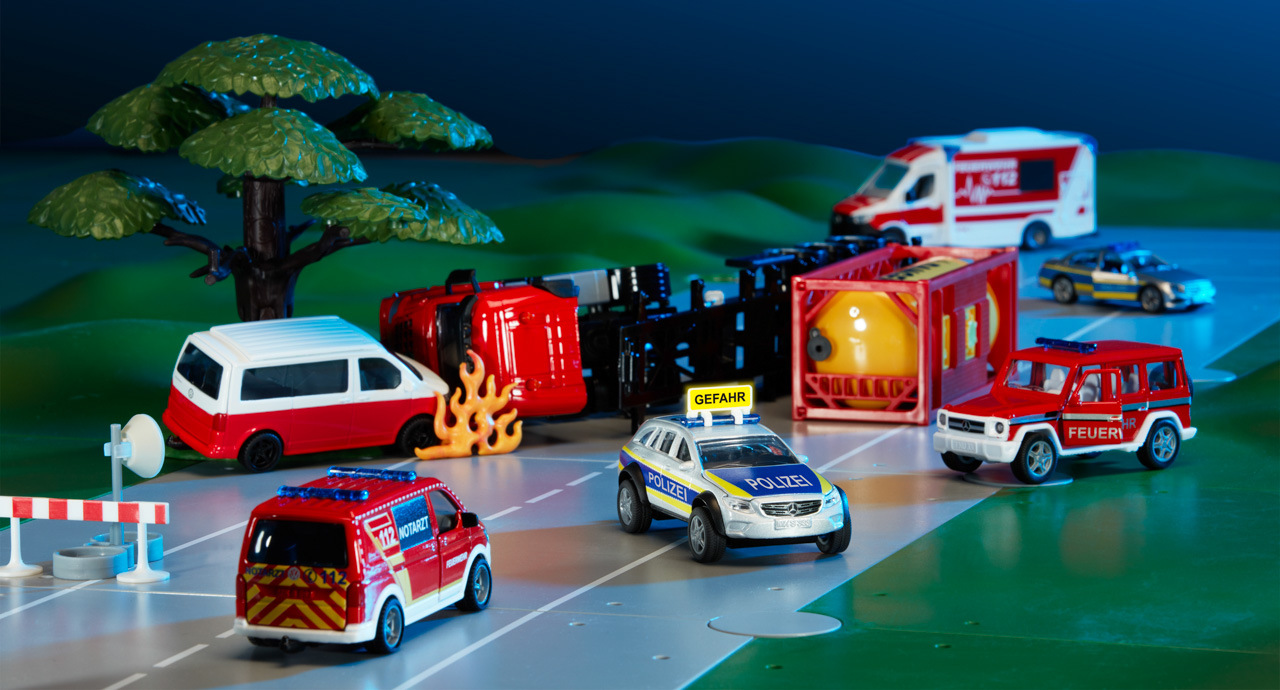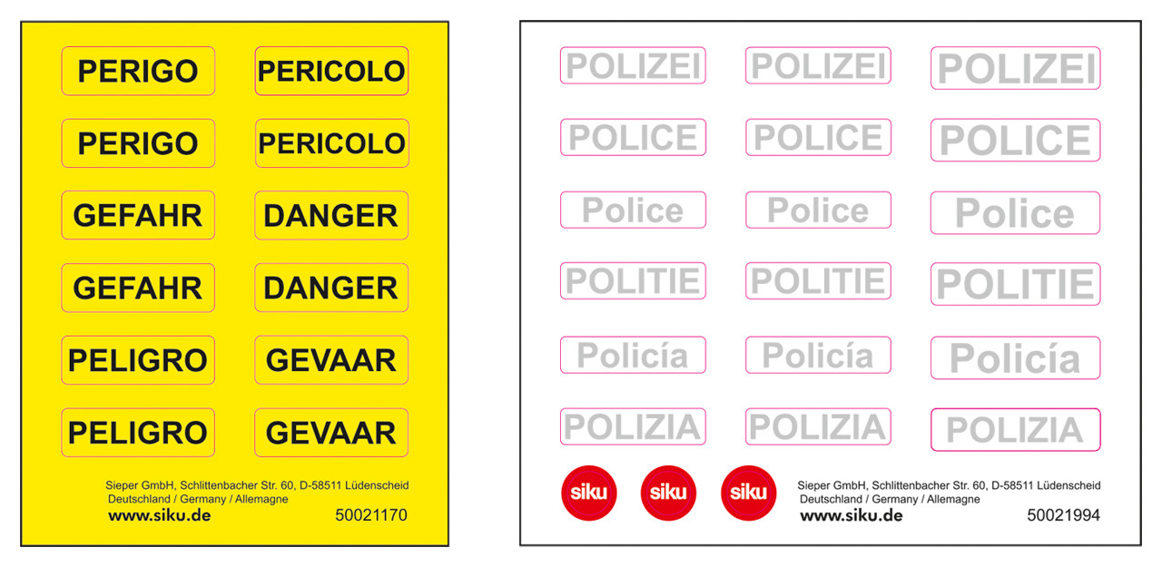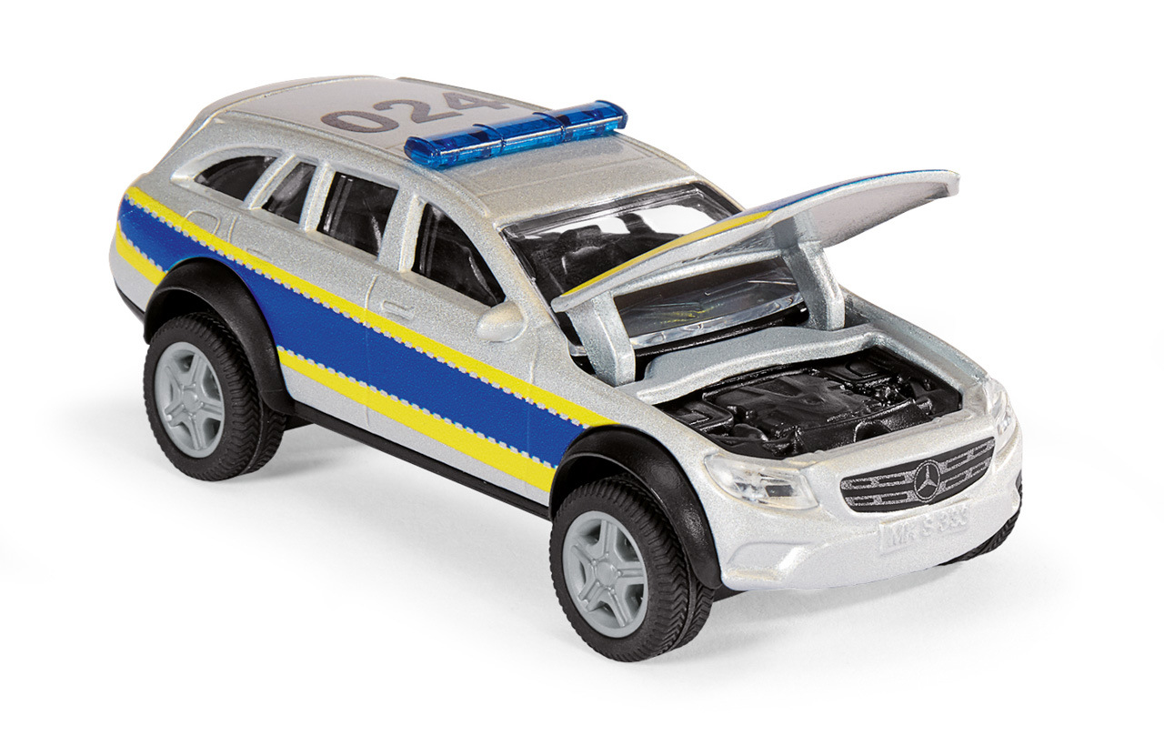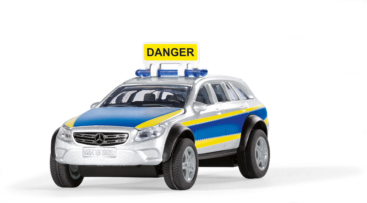 Terénní policejní vozidlo 4x4 od siku je skutečným off-roadovým specialistou. Žádná trasa není příliš drsná, žádný terén není příliš nerovný, žádné místo nasazení není příliš kamenité – servisní vozidlo třídy E od Mercedes Benz s extrémními terénními schopnostmi si dokáže prorazit cestu kamkoliv. Kapotu a zadní víko lze otevřít a na lištu nouzového osvětlení na střeše lze nalepit další výstražný štítek. Kromě toho je k dispozici list fluorescenčních nálepek „Danger“ v různých jazycích. Další nálepky „Policie“ lze nalepit na stříbrno/modré boky vozidla, které má žluté signální značení, a také na kapotu. Policejní vozidlo třídy E All Terrain má tažné zařízení, které je kompatibilní s mnoha přívěsy siku. Rozměry balení: 15,5 x 7,5 x 6,5 cm. Věk: 3+