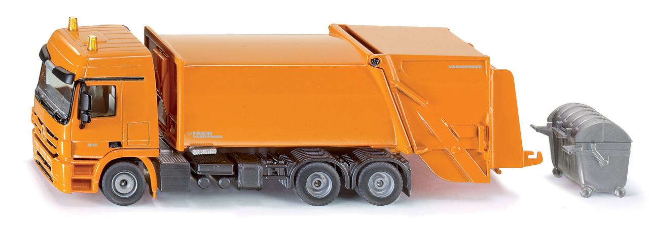 Model oranžového popelářského vozu v měřítku 1:50, vyrobený z realitě odpovídajících materiálů, kov, guma, plast. Auto je plně funkční a model je doplněn funkční popelnicí.