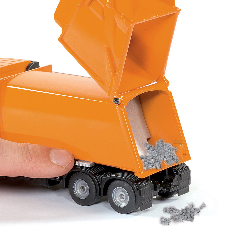 Popelářské auto. Kovový model má plastovou nádobu na odpadky, která se dá zvedat a vyklápět. Zadní část nádoby má výsek pro kontrolu obsahu a lze odklápět pro snadné vysypání odpadků Model je vyroben z kovu v kombinaci s plastovými doplňky. Rozměr: 87 x 28 x 44 mm. Rozměr balení: 9,7 x 3,2 x 7,8 cm. Věk: 3+
