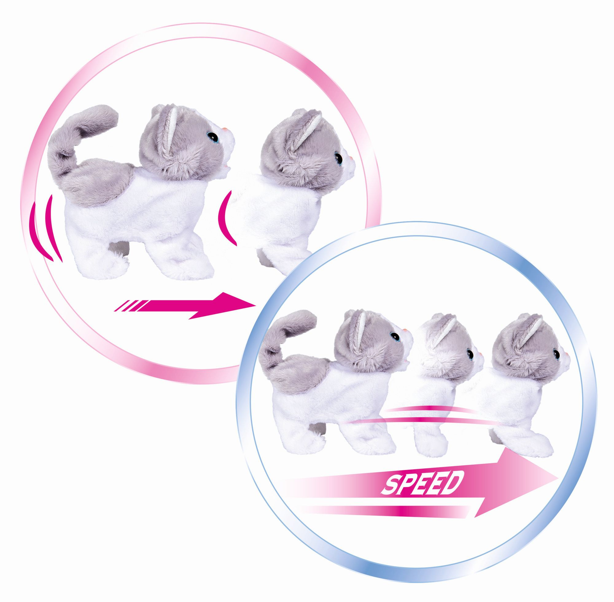Šedobílá kočička z měkkého plyše se může pohybovat dvěma různými rychlostmi a vrtět ocáskem. Vydává skvělé zvuky. ChiChi LOVE kočička je 15 cm vysoká.