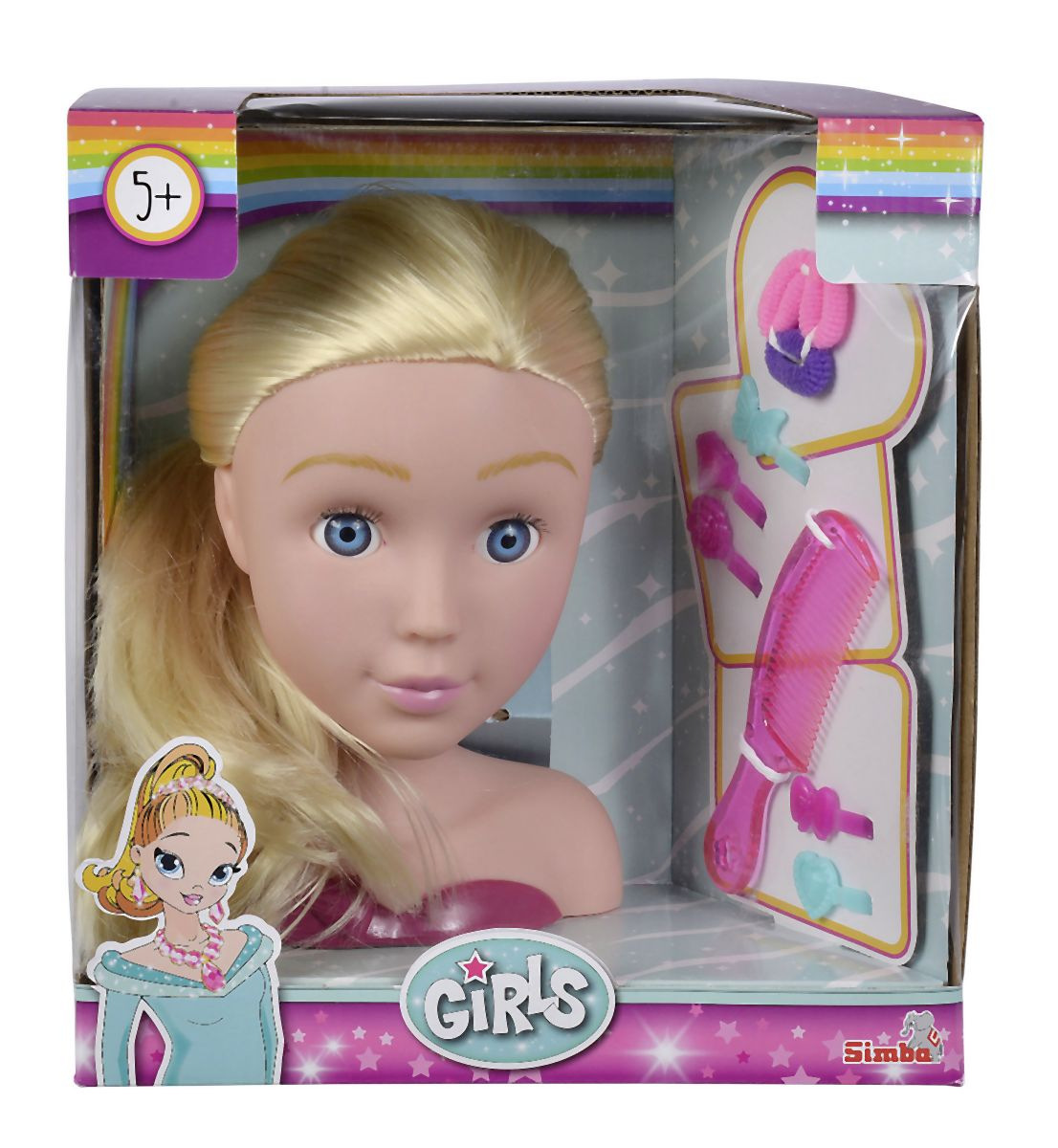 Česací hlava pro zkoušení trendy účesů. Nezbytné doplňky součástí, např. sponky, klipsy do vlasů, hřeben, hřebínek. Celkem obsahuje 10 ks příslušenství. Výška 19 cm.