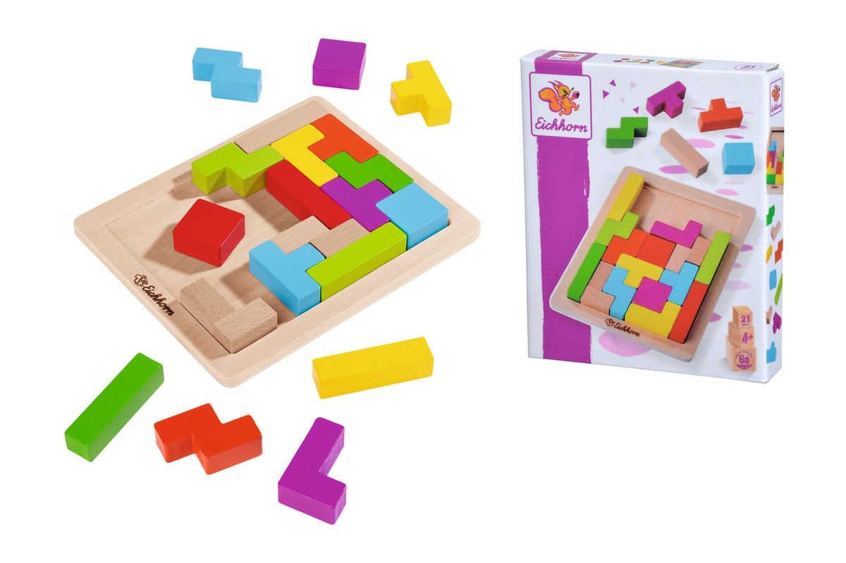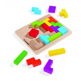 Dovednostní hra pro 1 hráče, 20 ks barevných různě tvarovaných kostek z bukového dřeva na desce z překližky, 5 tvarů kostek, rozměry: 18 x 15 cm.